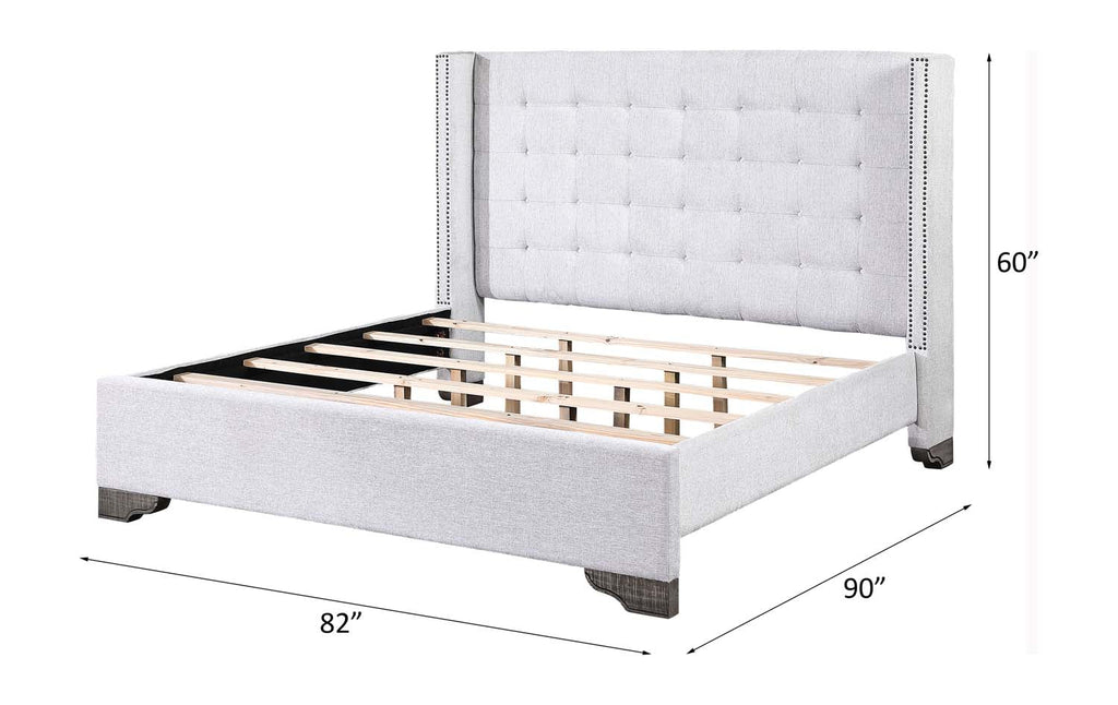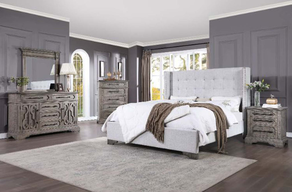 The Artesia bedroom collection provides a commanding presence in any room. This contemporary fully padded bed in tan fabric associates with button-tufted headboard with nail-head trim. Attention to details' the matching case pieces are featured with raised scrolled inlays. Also available with two different styles of bed' this fashionable bedroom set will fuse with the surrounding decor and transform a room from ordinary into something interesting and sophisticated.