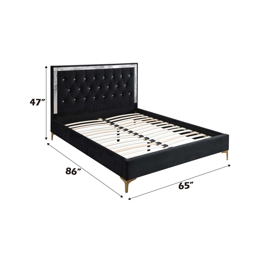 Upgrade your entire bedroom space with this modern and sophisticated masterpiece. It features a upholstered headboard with crystal-like button tufted details that add a modern glamour to this piece. Faux marble printed trim accent surrounding the headboard sets a stark contrast to soft upholstery. Stylish metal legs give the bed an elegant support. Express your style and make a bold statement in your personal space.