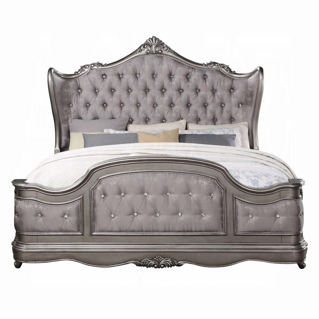 Create the feel of a European chateau in your bedroom with the Ausonia collection. Gathering inspiration from vintage Rococo design, featuring intricate carvings that embody the period. The wingback headboard is a classic design is accented with crystal-like button tufting that adds texture and a touch of glimmer for a regal look. The antique platinum'finish has a brilliance to it that draws attention to the eyes