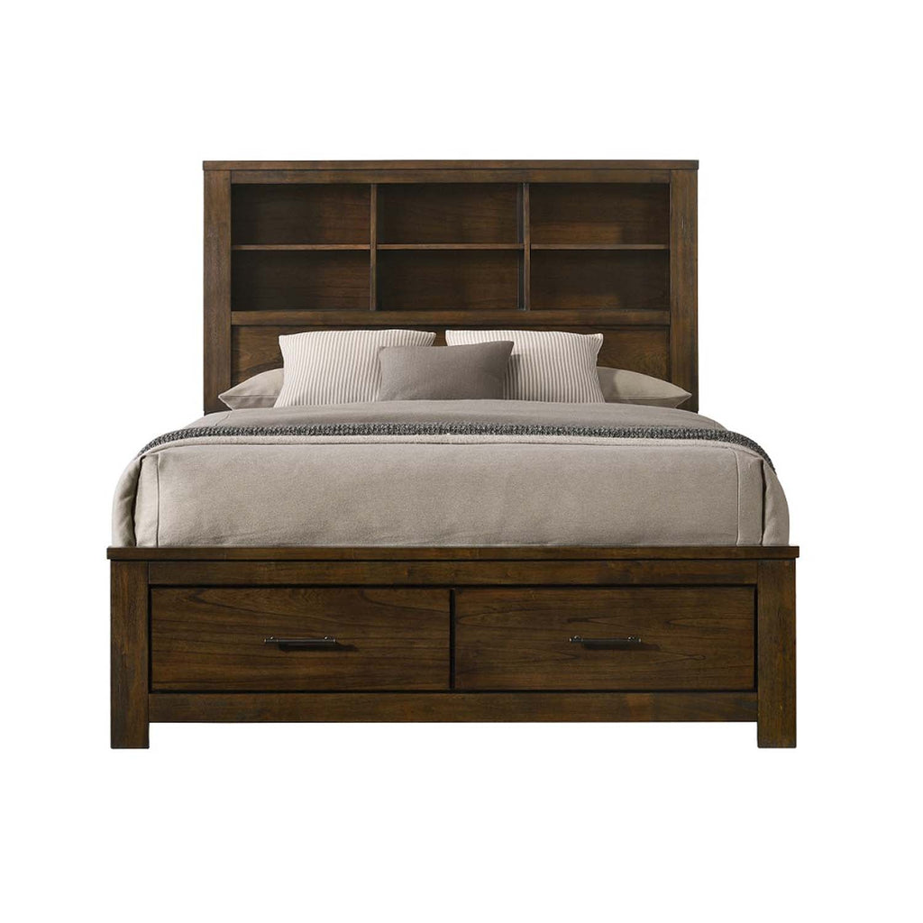 The transitional Merrliee II bed has all the traditional details you are looking for to create a warm atmosphere in your bedroom with its oak finish. Featuring a storage headboard with spacious shelves for displaying books, decorative items, and picture frames. In addition, it also offers two ample footboard storage drawers. The brass metal hardware adds a subtle rustic touch. This bed has it all, style, storage, and reliability; order yours today.