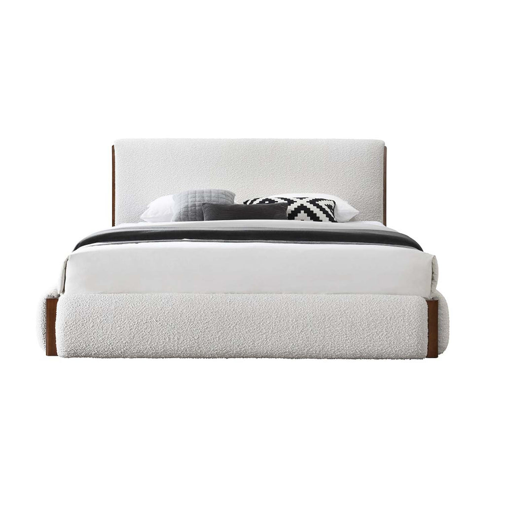 Sandro Queen Bed, White Boucle & Walnut Finish