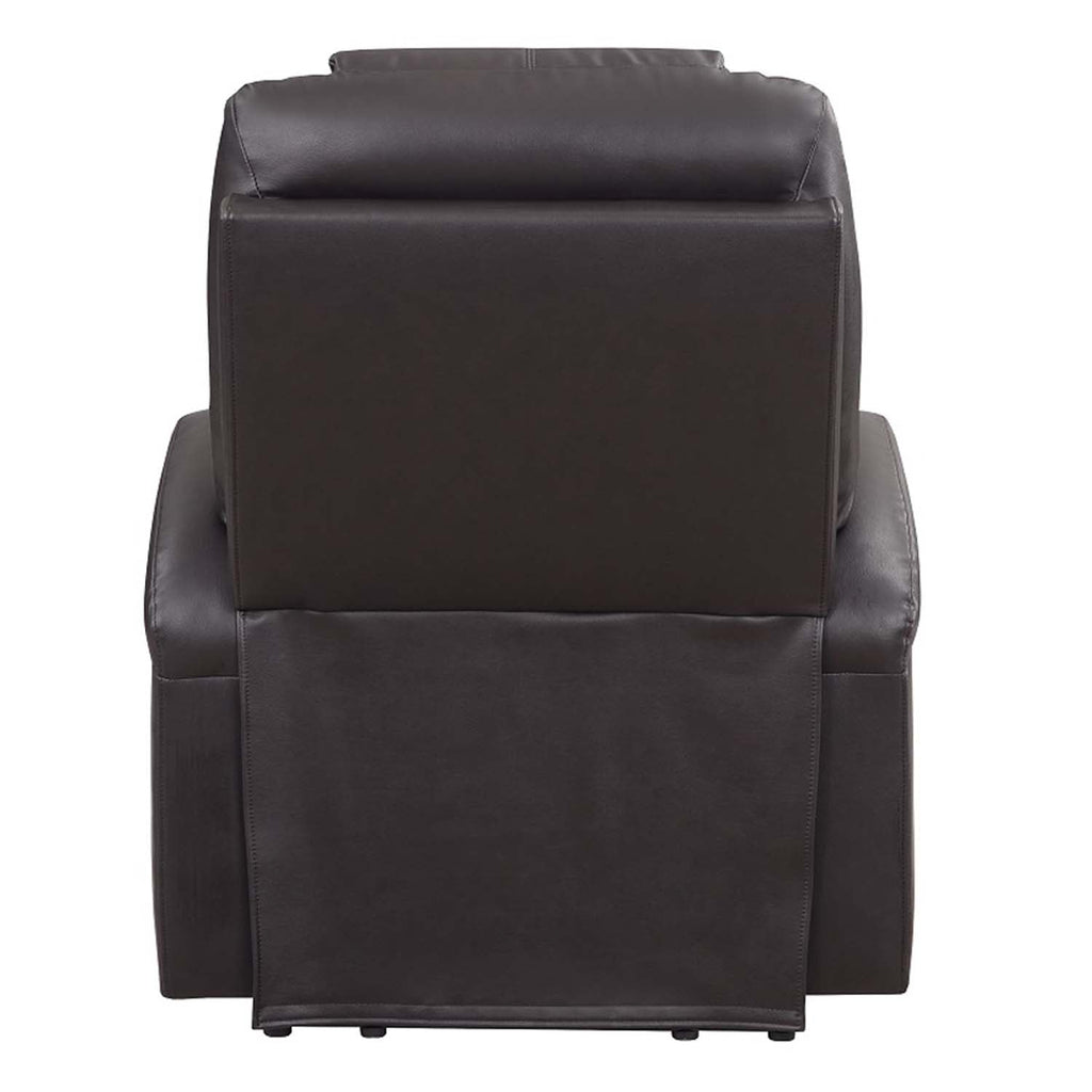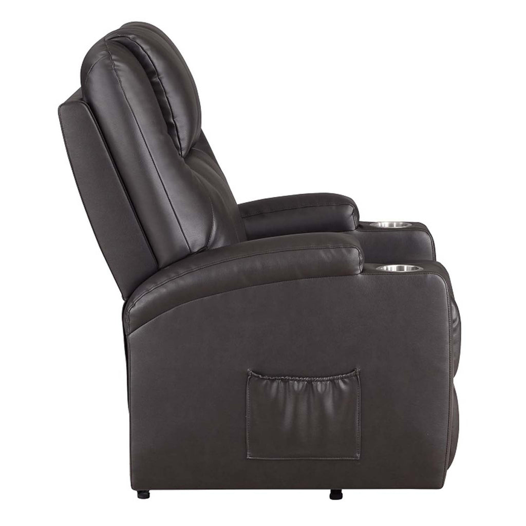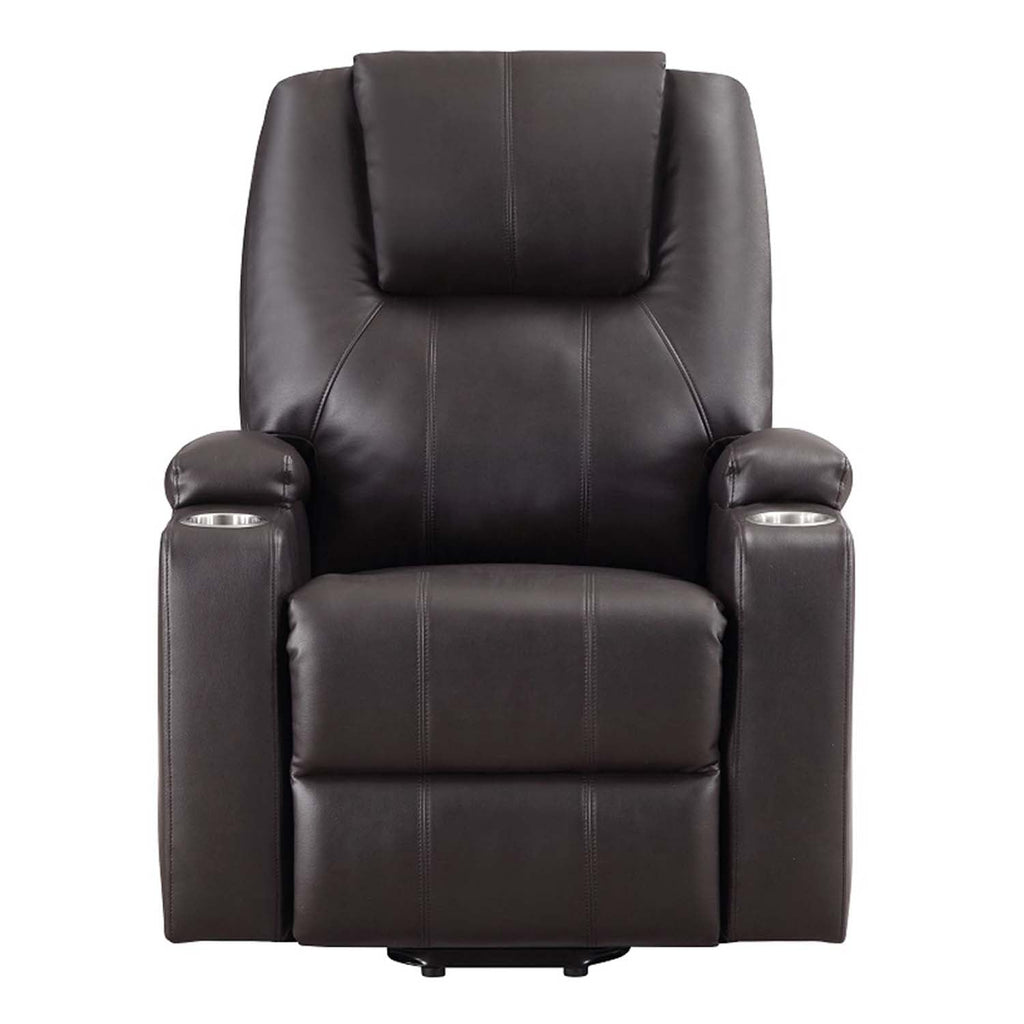 This Evander recliner chair with lift features a mechanism with a motor that helps to push the entire chair up to help senior citizens stand up easily without adding any stress to the knees and back, and you can adjust the lift or reclining position. The recliner chair comes with multiple vibration massage points and lumbar heating, which is controlled by the convenient remote control. The height of the padded headrest ensures comfort for people of all heights. The brown leather-aire is easy to maintain. With overstuffed padding and simple lines sketched out on the backrest for a more comfortable seating experience. The heavy-duty base is made with a sturdy, anti-tipping design. It also features two cup holders and side pockets for drinks and magazines.