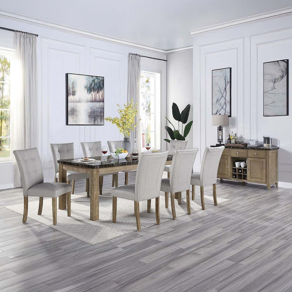 The Charnell dining collection is designed in a transitional style to complement any home. The beautiful marble tabletop and oak finish complement each other beautifully. The standard dining height table and durable marble top will withstand the test of time. The PU padded dining chairs are just as comfortable as they are stylish. The matching server is a wonderful storage solution for your dining area, also featuring a marble top and oak finish.