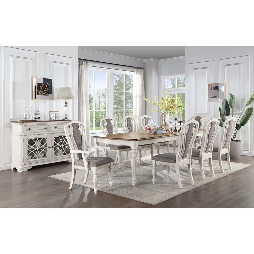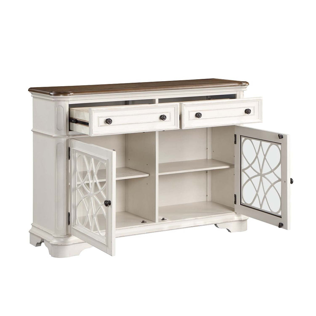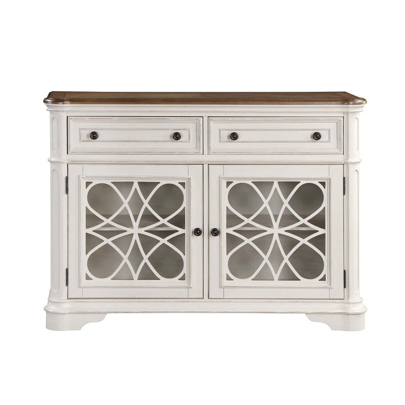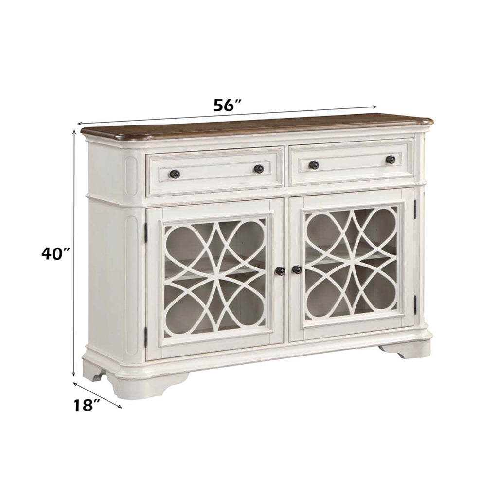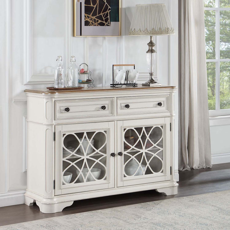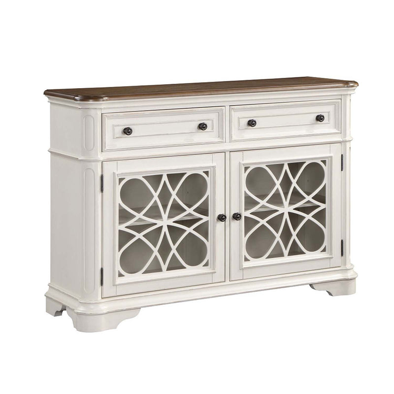 Experience the beauty and functionality of this exquisite Florian server, where the antique white finish and oak finish top come together to create a harmonious blend of classic and natural elements. Let this server be a statement piece that adds a touch of sophistication to your space while providing a practical storage solution for your dining essentials. With two drawers, this server provides convenient storage for your dining essentials, such as cutlery, napkins, or small serving utensils. The lower cabinet space provides additional storage options for larger items, such as serving platters, table linens, or dinnerware. The cabinet doors have glass inserts and offer a clean and organized look to your dining space.