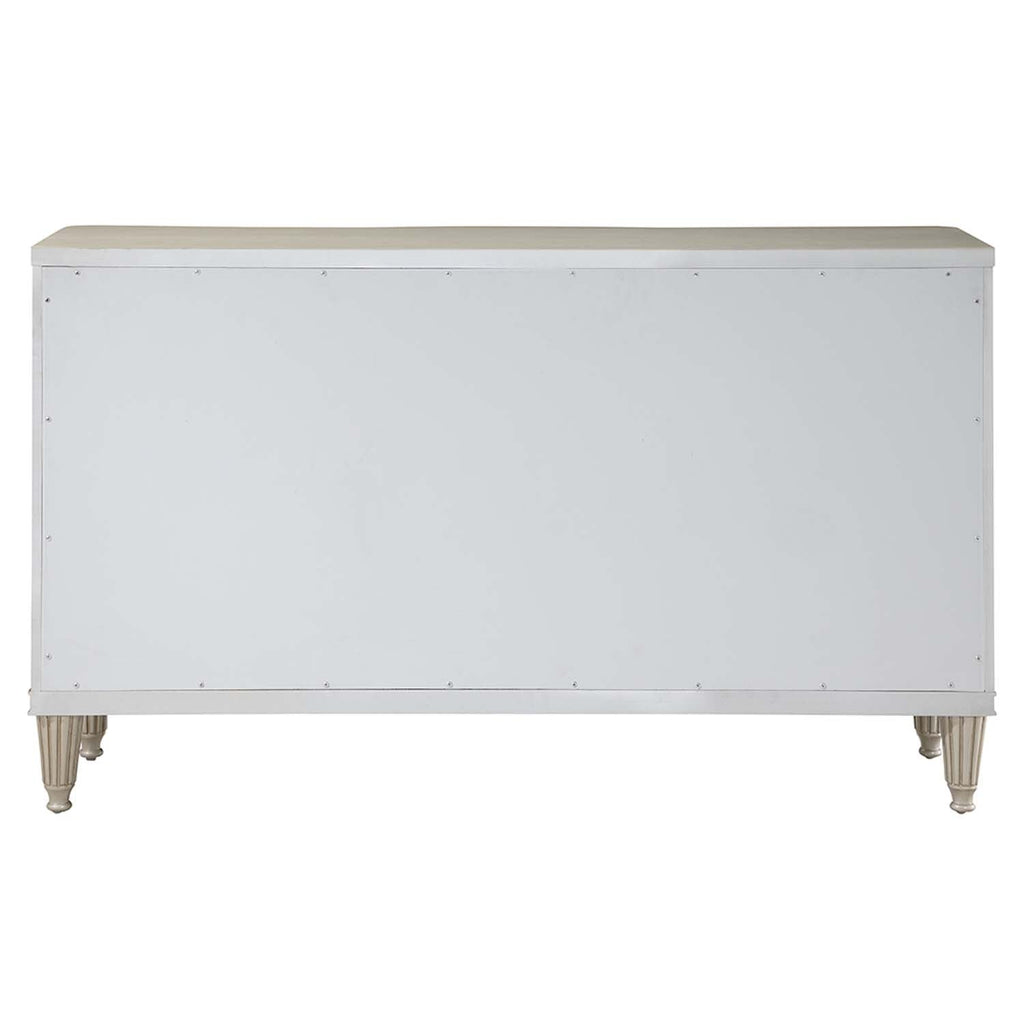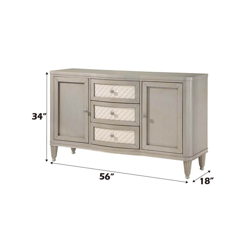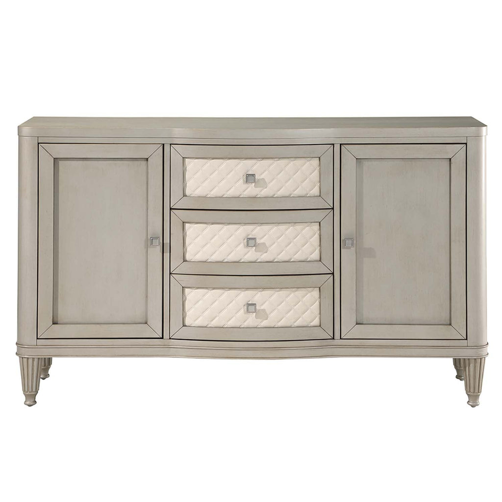 Give your dining space a much-needed storage solution with the Elyssa server. This server features three ample drawers and two side cabinets for all your extra dishware, glassware, and linens. The drawers showcase synthetic leather quilted drawer fronts. The piece sits on eight beautifully crafted fluted wooden legs. It is finished in a champagne color that adds a stylish touch.