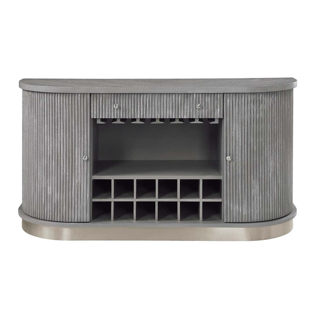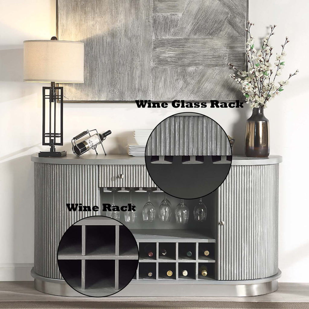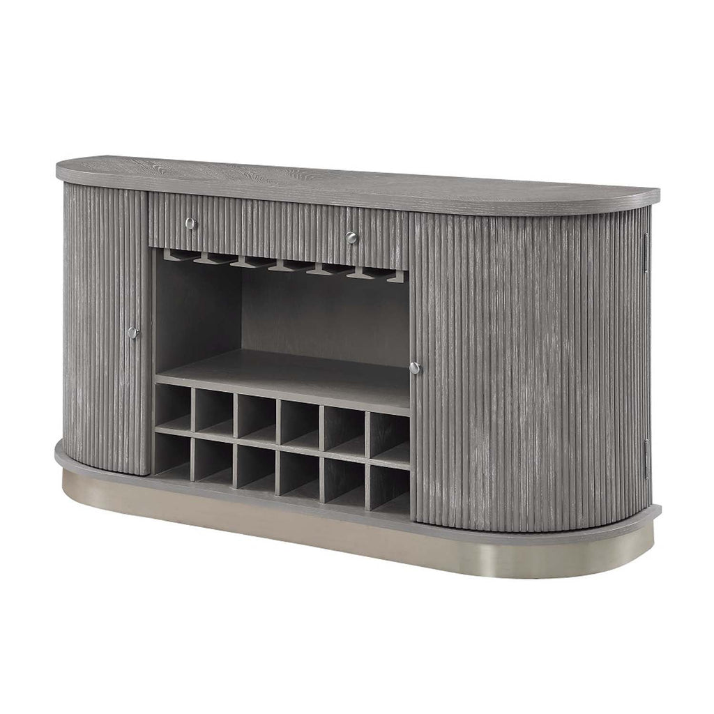This Adalynn server brings a sleek space for you to store and display your wine bottles and stemware in your dining room or eat-in kitchen. This piece stands on a sturdy wooden frame with a sleek silver metal base and is finished in a weathered gray oak finish that showcases white wooden grains. Features a slatted textured frame with rounded corners for a sculptural silhouette. It has a drawer and two cabinet spaces; plus stemware racks and wine bottle storage. Streamlined with luxe details, it complements glam and contemporary decor styles.