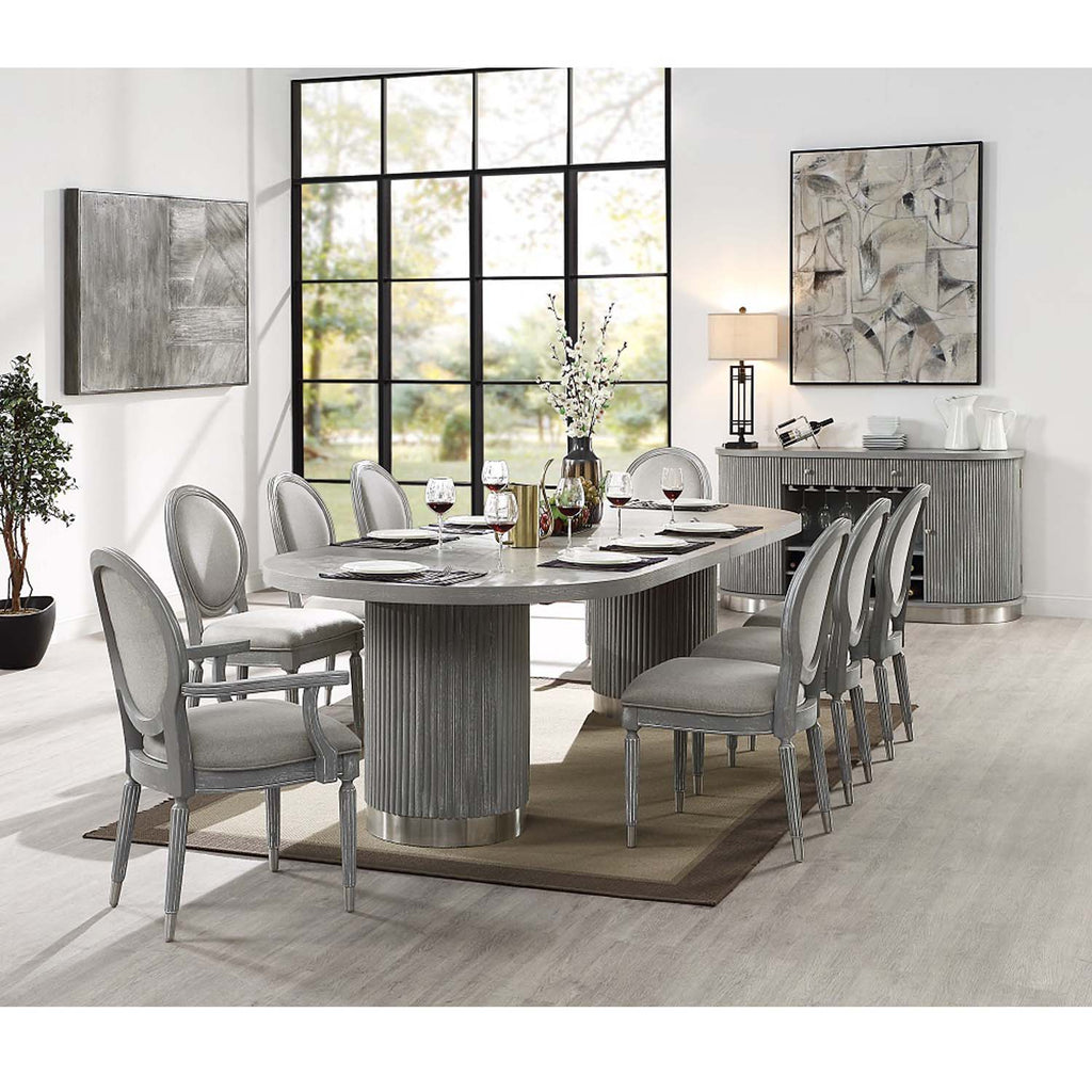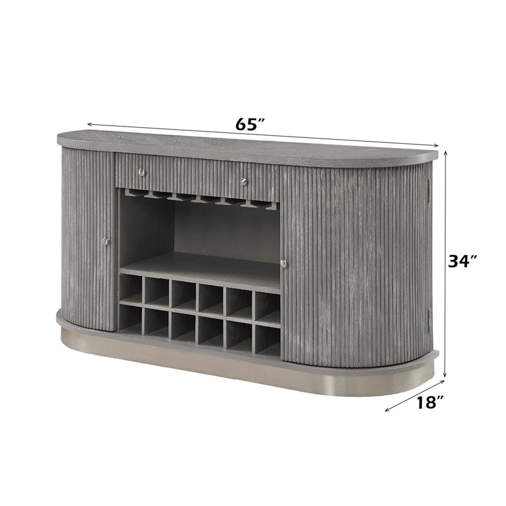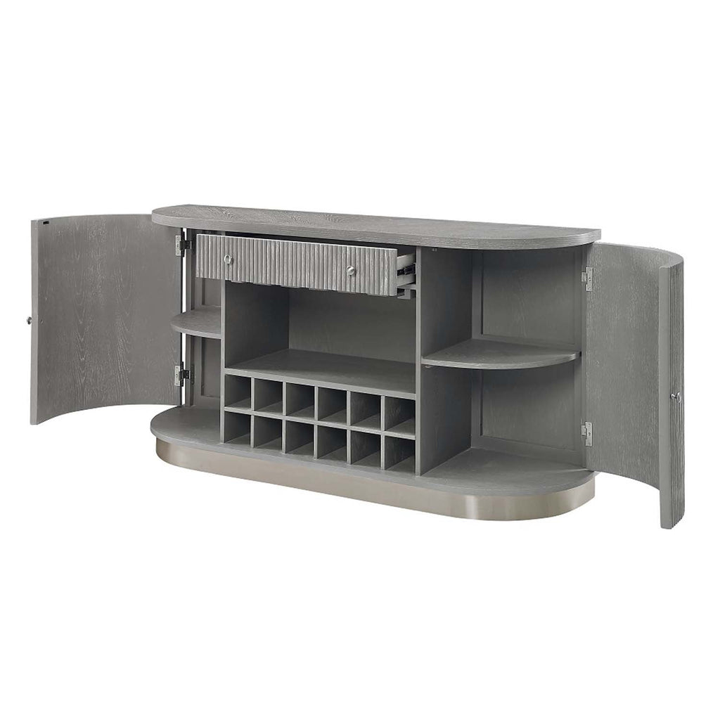 This Adalynn server brings a sleek space for you to store and display your wine bottles and stemware in your dining room or eat-in kitchen. This piece stands on a sturdy wooden frame with a sleek silver metal base and is finished in a weathered gray oak finish that showcases white wooden grains. Features a slatted textured frame with rounded corners for a sculptural silhouette. It has a drawer and two cabinet spaces; plus stemware racks and wine bottle storage. Streamlined with luxe details, it complements glam and contemporary decor styles.