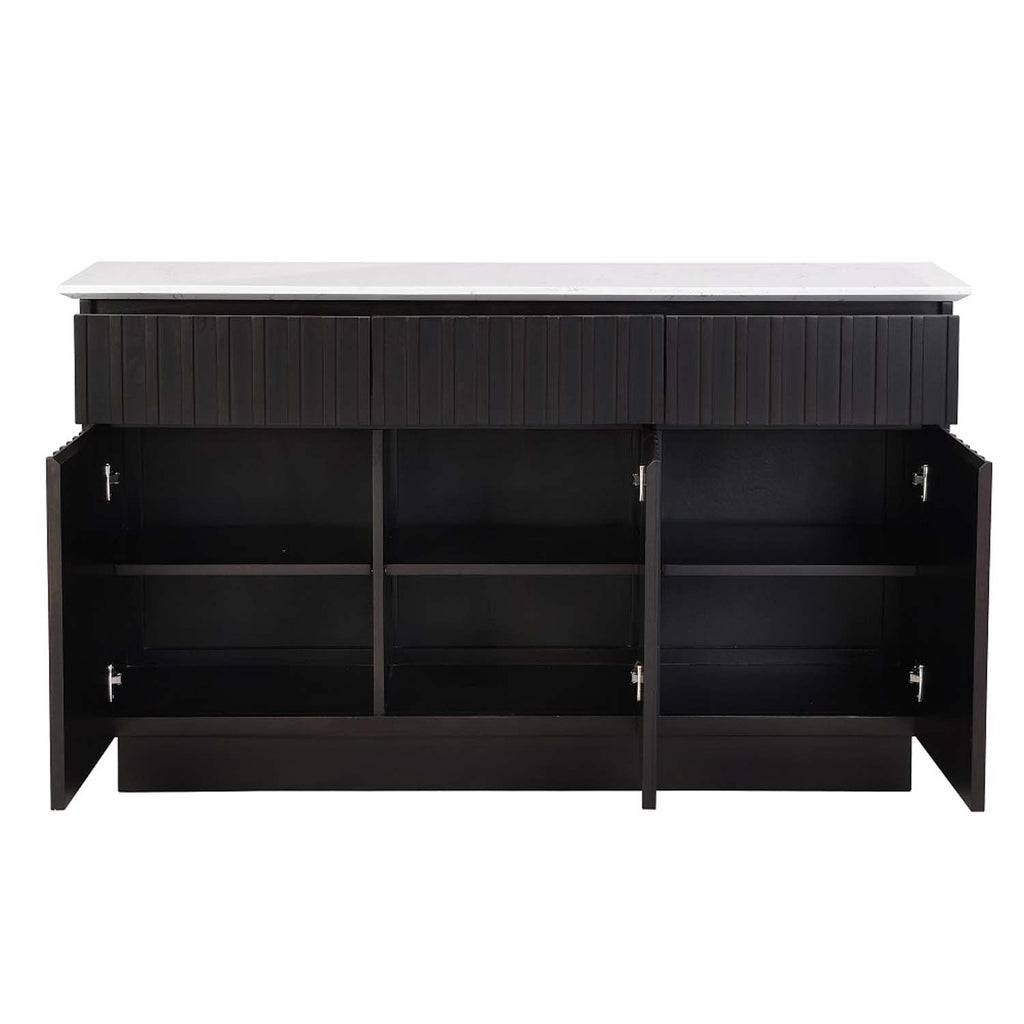 The Jaramillo server has a unique aesthetic, borrowing elements from both the mid-century modern style as well as from contemporary minimalism. Its slatted frame is uncluttered yet sophisticated in design with a stylish mixture of wood and engineered marble. Featuring three drawers and three cabinet spaces to keep your dining area clutter-free. The black finish creates an upscale look that will impress your guests.