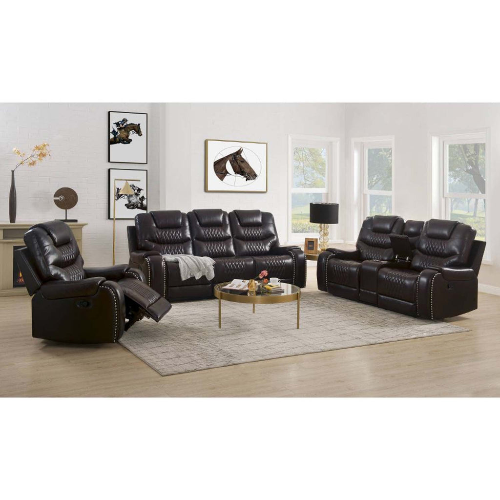 If you're serious about comfort, then the Braylon motion sofa set is made for you. The dark brown color of the PU upholstery keeps your entertainment area looking sharp. In addition, the diamond tufted patter in the tight back and seat cushions add not only great visual interest but a sense of structure to the sofa design. The loveseat is equipped with a storage console with lift top and cup holders. Each piece in this set features pillow top armrests and external push-button latches for convenient reclining motion. The Braylon set is available in two colors, with an additional option of power motion recliner chair.