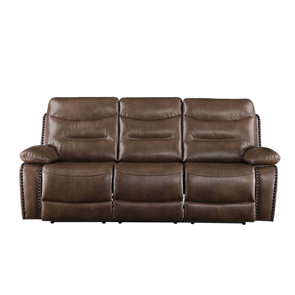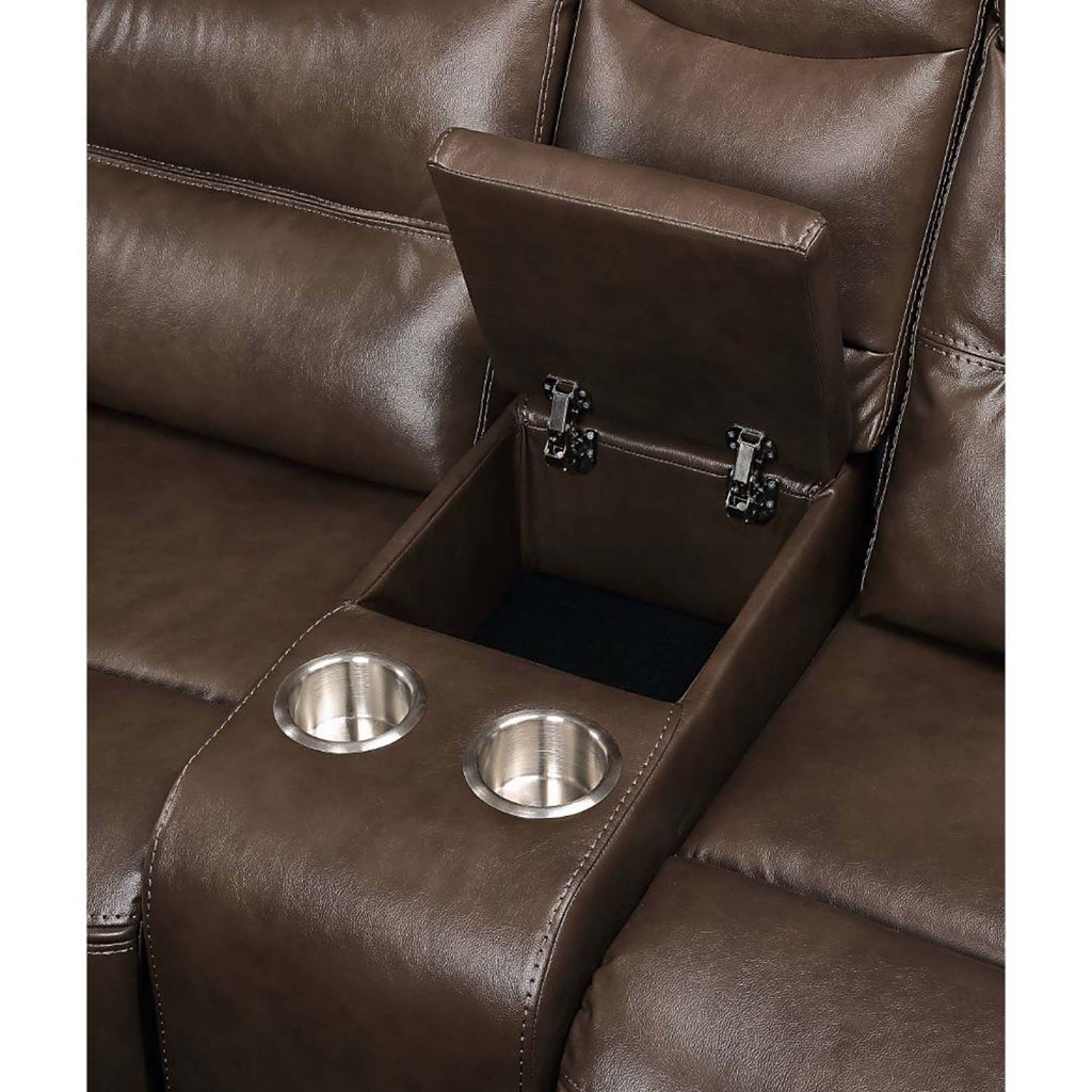 The Aashi motion sofa set is upholstered in soft leather-gel match in a timeless, rich brown color. Horizontal tufting on the backrest cushions add some style to this set, while the pillow top armrests ensure total comfort when you nestle into the pocket coil seats. The loveseat includes a storage console with cup holder for convenient access to your favorite beverage. Bring home the relaxing Aashi motion sofa set, and get ready to lean back and say .. "Ah..."