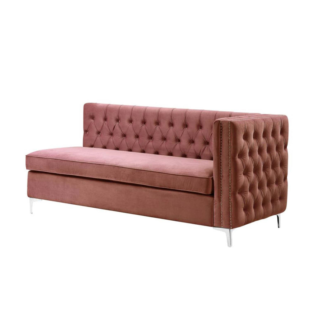 Frankly, the Rhett sectional sofa is simply stunning. Vibrant velvet upholstery pops against a boxy silhouette. Button tufting extends around the inside and outside of high shelter armrests as well as the both sides of the tight seatback. Metal bracket legs and nailhead trim add some shine to of this L-shape sectional.