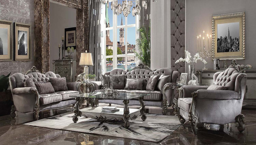 The Versailles collection with antique platinum finish will create you an elegant, warm and traditional taste in your living room. The sofa set reflects highly decorative base with scrolled feet, and the upholstered seats with the deep button tufted and Nailhead trim accents add classic character and represents luxurious detailing. The collection is your perfect choice for your living room.