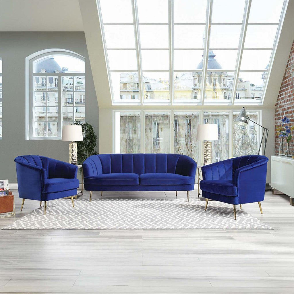 This Eivor trendsetting collection will add style and color to any room. The collection features soft feminine curves and channel tufting to create a modern home. Upholstered in a sumptuous blue velvet that is classy and bold. The metal legs and wooden inner frame make for a sturdy piece that will last for years to come. The sofa is ideal for leaning back and relaxing in style. Expand your seating area with the matching chairs.