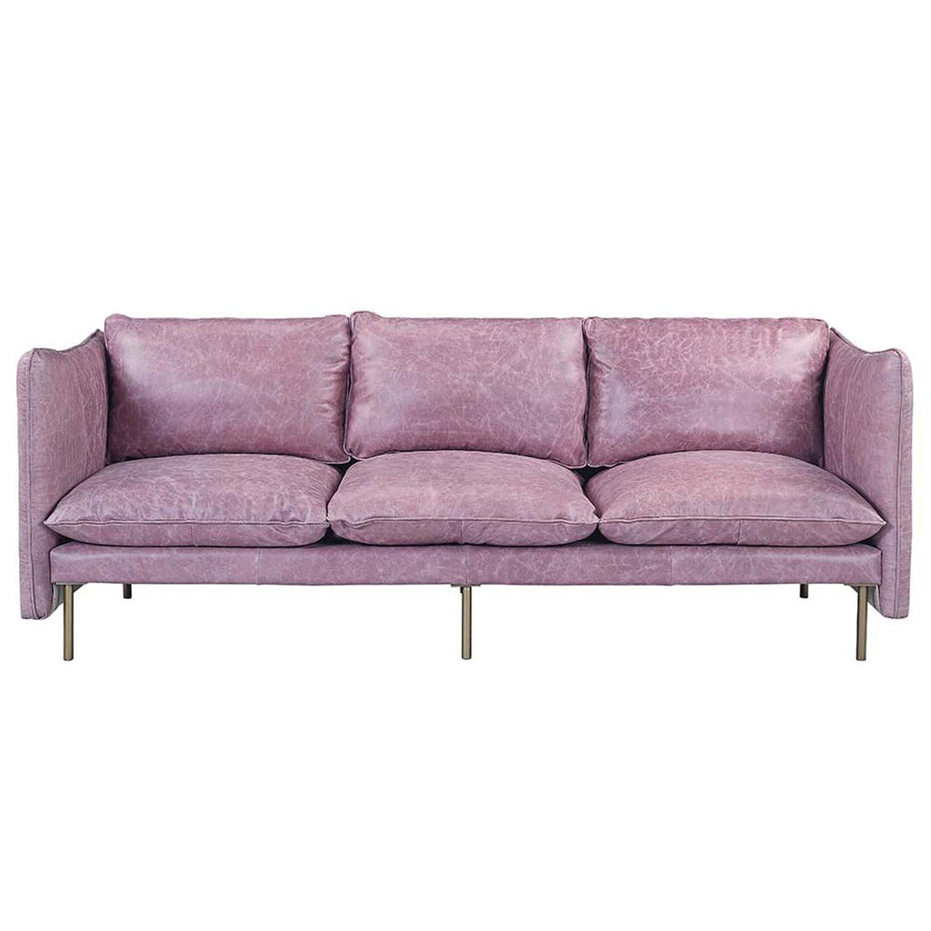 The Metis sofa is upholstered in buttery soft top grain leather in a Wisteria color that adds a touch of effortless romance to any room. The luxurious sofa is equipped with ultra-plush cushions and backrests. The metal brass legs add a hint of modern industrialism to the simplistic design. The inner wooden frame makes for a durable piece.
