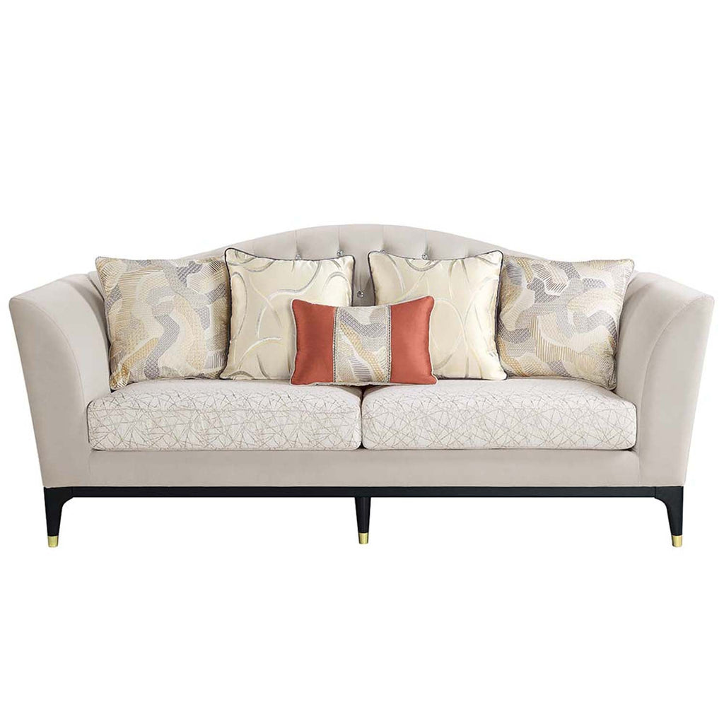 The Tayden camel back sofa brings classic elegance to any living room. Sophisticated curves and crystal-like button tufting adorn the upholstered backrest. For added richness, the seat cushions are upholstered in a geometric fabric. The black base and feet are offset by gold tips adding a subtle contrast and rich depth to the upholstery. Assorted throw pillows top the seat for added softness and streamlined style.