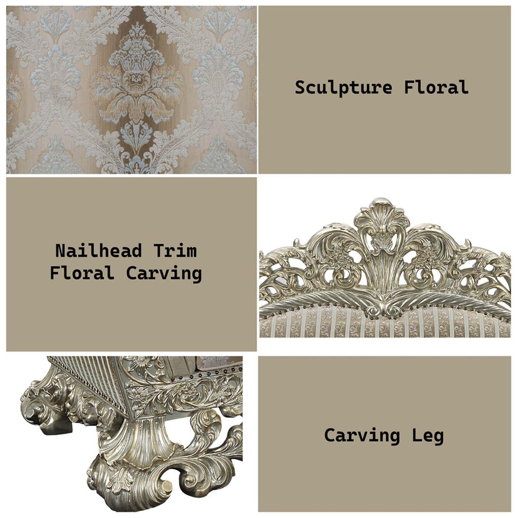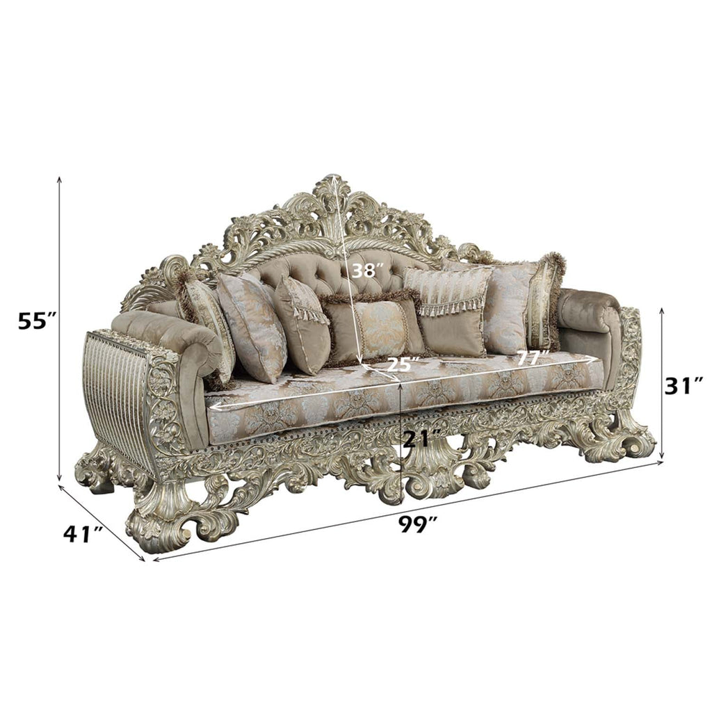 Leave your guests speechless when they enter your living room with the Sorina sofa. The stunning gold outer frame is flawlessly paired with the crystal-like button tufting to create a rich look. The damask upholstered seat cushion perfectly complements this sofa. Elaborate design features are what make up the Sorina collection.