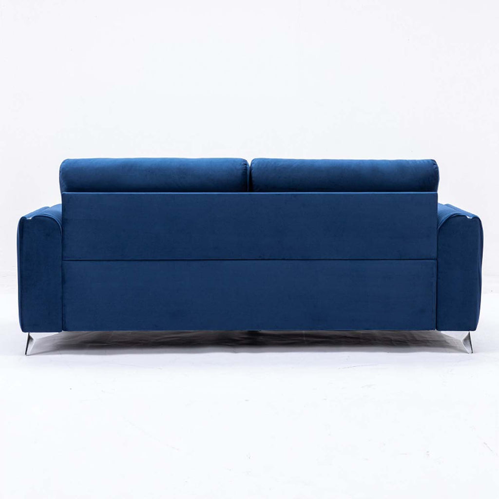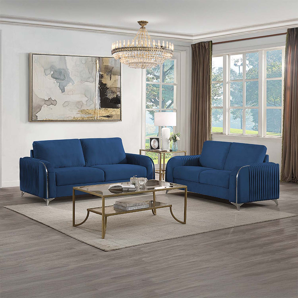 Make a bold statement with the Wenona blue velvet sofa. The blue color of the velvet upholstery is a classic color that will provide a fun pop of color in any home. This sofa is highlighted with polished chrome trim accents along the armrests and legs to match. The armrests boast eye-catching vertical pleating that creates a beautiful contemporary 3-D effect. This sofa offers plush pocket coil seating for hours of comfort around the TV with the family.