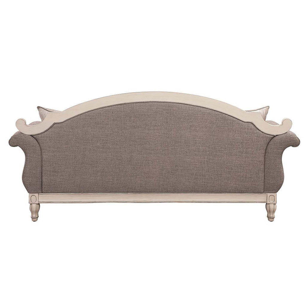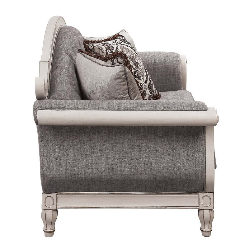Rustic with a modern flare, the Florian sofa offers the best of both worlds. The gray fabric and antique white finish of this sofa create a harmonious design. The rolled arms and wooden trim add charm, while the classic button tufting creates visual depth. The plush foam seat cushion with pocket coils ensures that you get a restful place to sit and relax. Four throw pillows are included.