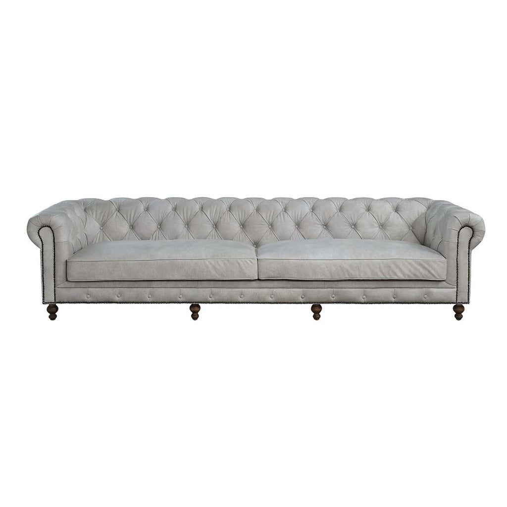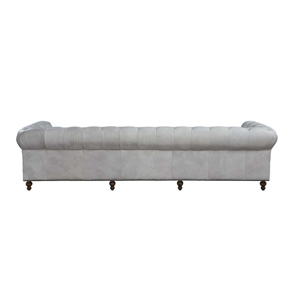 The luxurious top-grain leather and classic Chesterfield silhouette bring a clubby feel to our Ofer sofa. Deep-seated and sheltering, the square-profiled sofa features classic button-tufting, rolled arms, and neat tailoring. Its cushions are filled with full foam that provides luxurious comfort. The bun wooden legs have a dark finish to bring out the bright character of the white and vintage look of the leather.