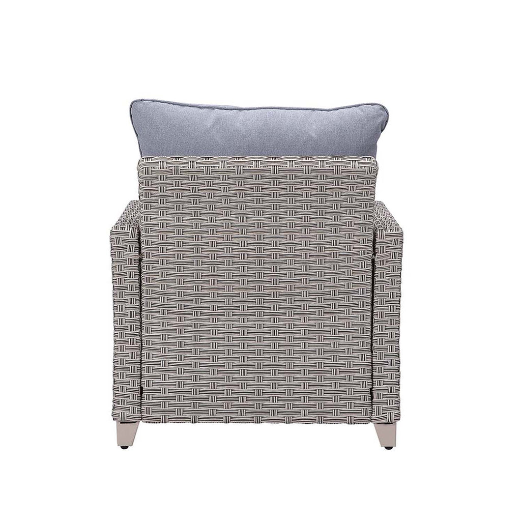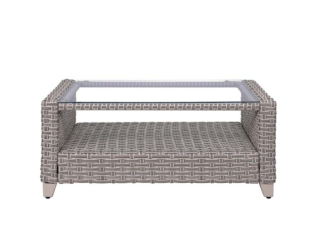 Enhance your outdoor living space with the Greeley patio sofa set. Place by a pool for the ultimate relaxing summer day with friends and family. Clean lines, low profile, minimalist, and fabricated in a subtle and elegant gray fabric and gray wicker with all components chosen to withstand moderate weather and humidity.