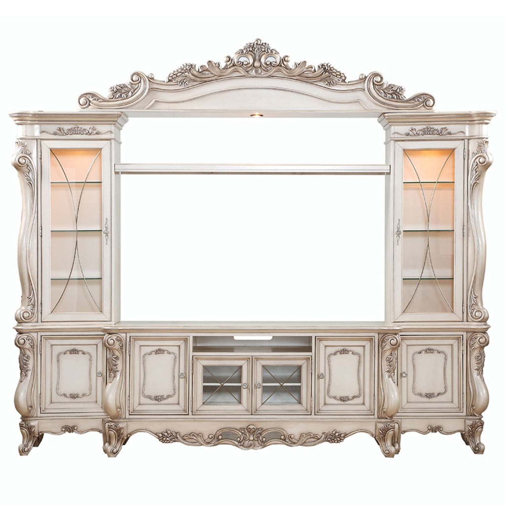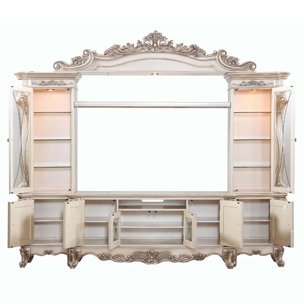 Exclusively designed and filled with romantic spirit, the beautiful Gorsedd entertainment center features Queen Anne legs and carved apron and trim, decorated with raised and oversized scrolled moldings in a golden ivory finish. This sophisticated living room unit has matching case pieces including a center TV stand and large left and right facing piers with mirrored backs, ensuring plenty of unique storage and display space. The collection boasts of multiple glass doors and glass display shelves and an elegantly arched and lighted center bridge. This stylish and detailed piece is ideal for entertaining guests and will add elegance to any living room Decor.
