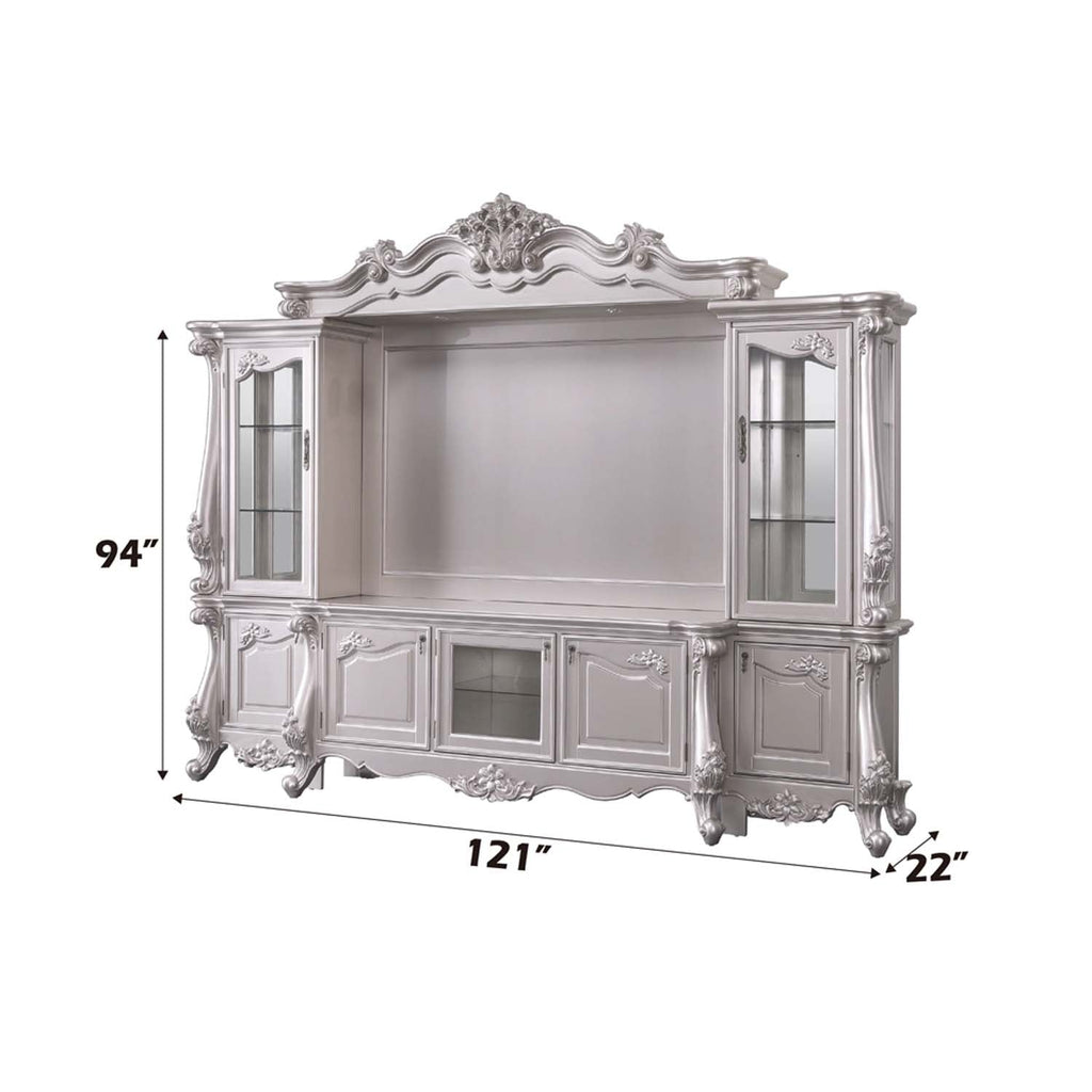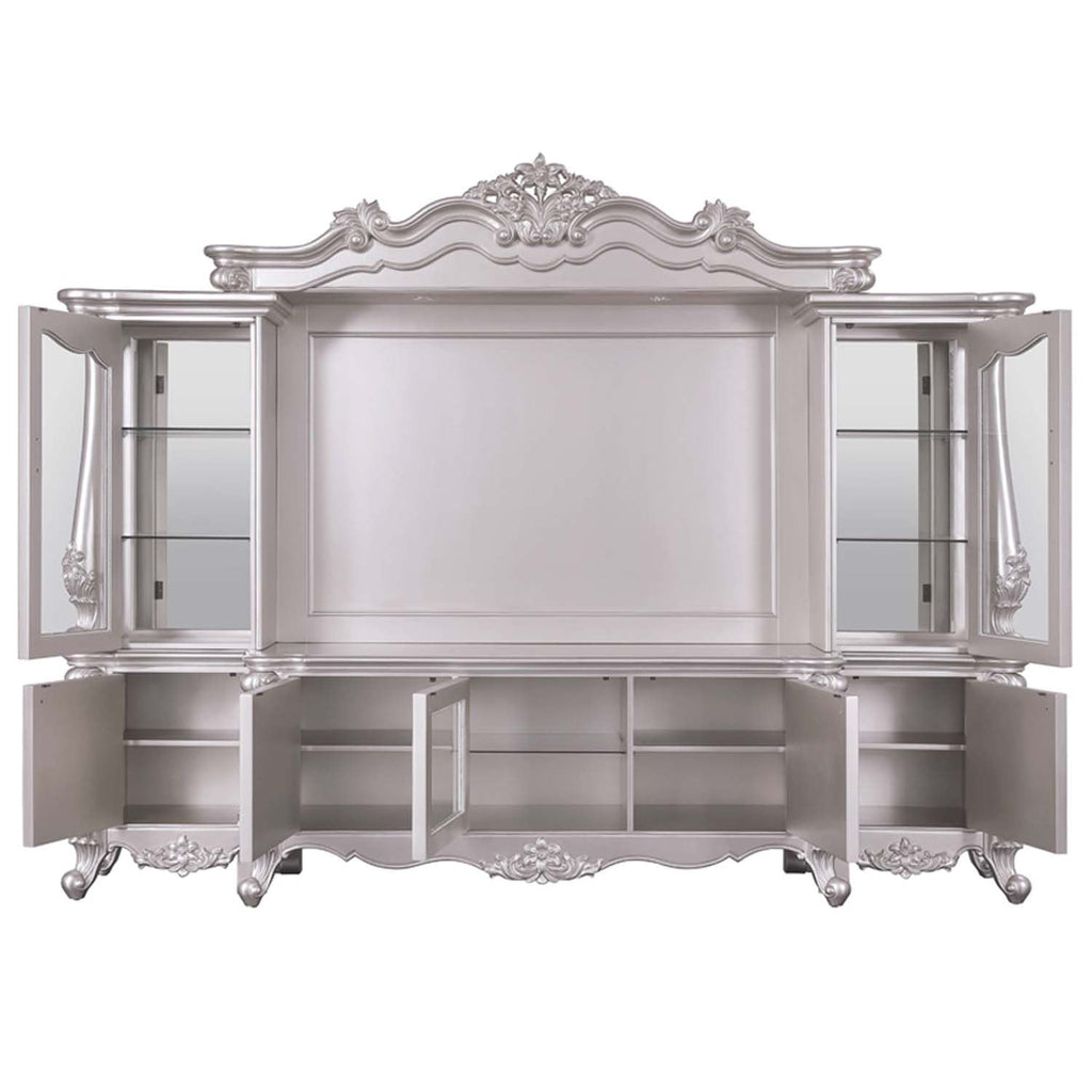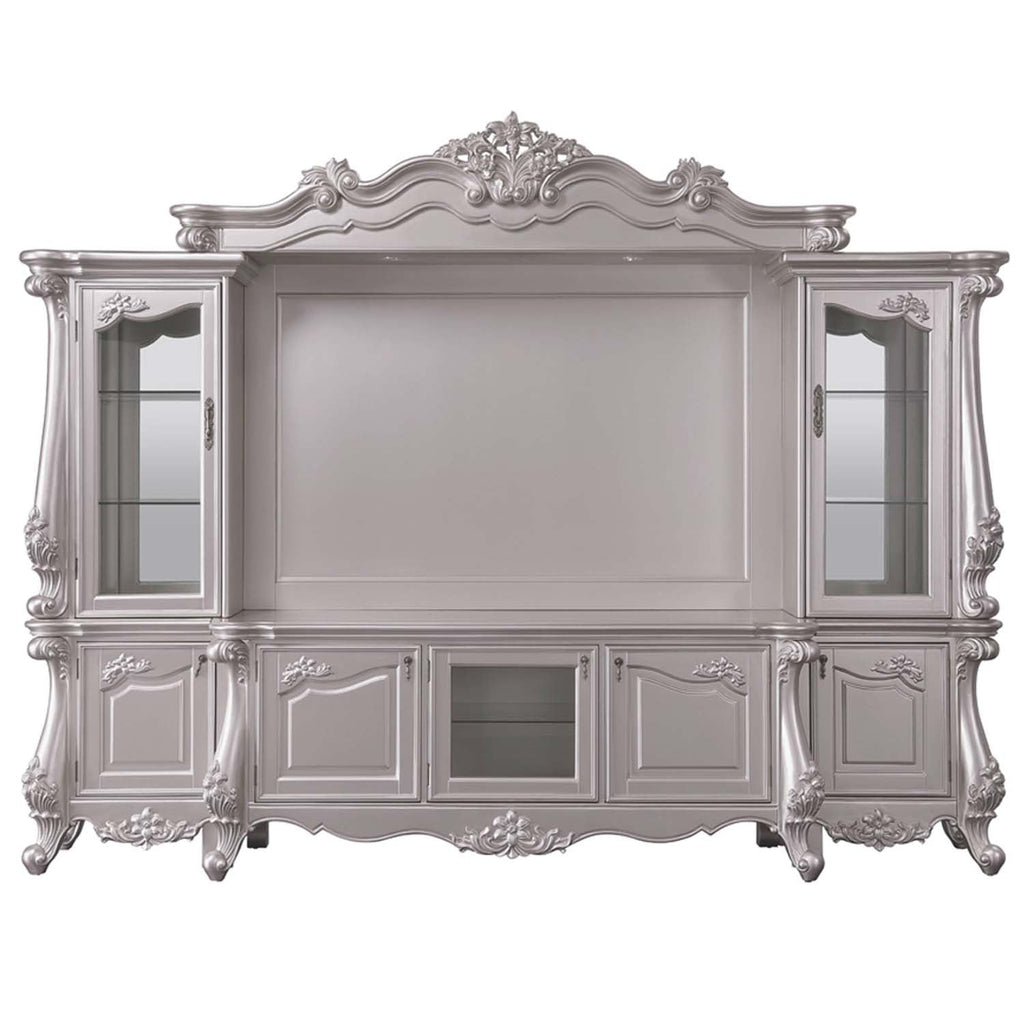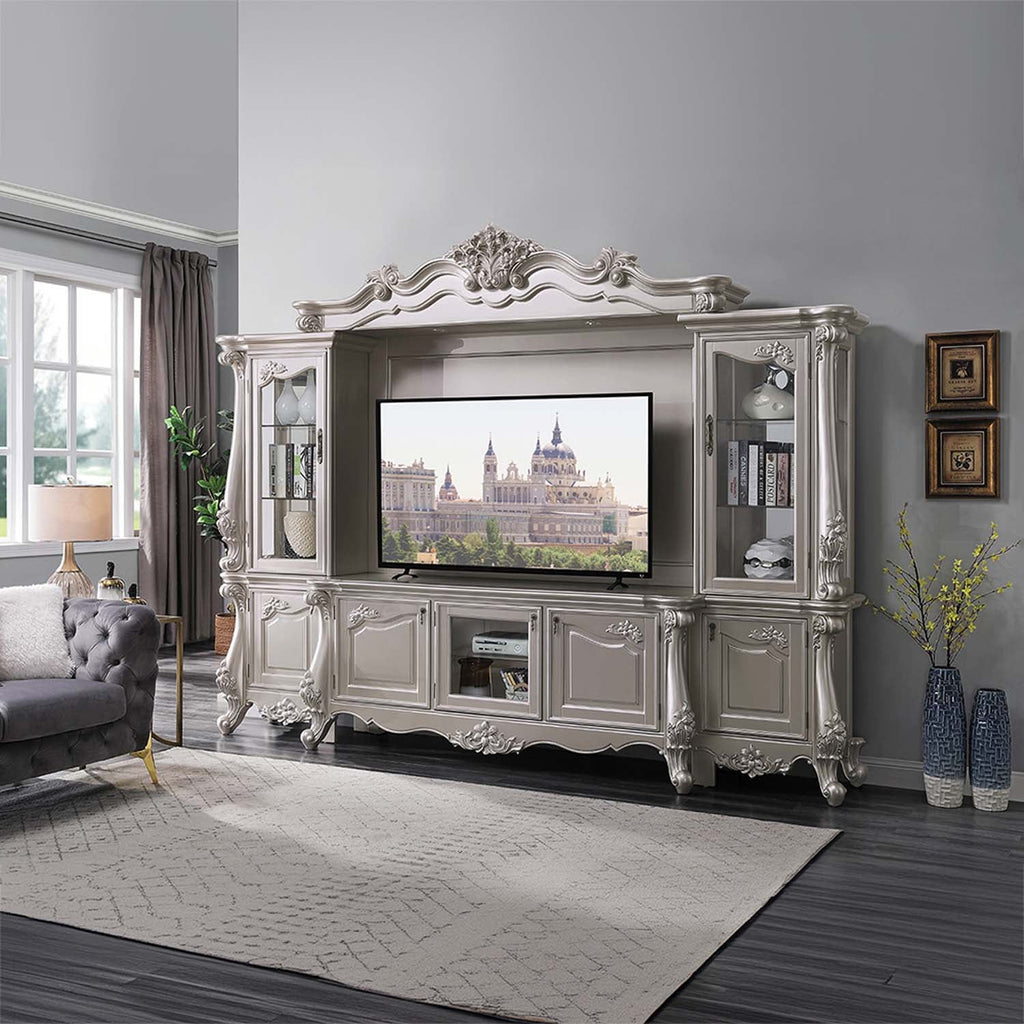 The Bently entertainment center is the perfect centerpiece for your media room. Gorgeous carved floral motifs and over-sized Queen Anne legs grace each part of this set. The TV stand easily accommodates a 70-inch panel TV. Coupled with the side piers, you'll have provide plenty of storage space for organization or display. A lavish carving crowns the lighted center bridge to emphasize the glory of this elegant, champagne-colored entertainment set.