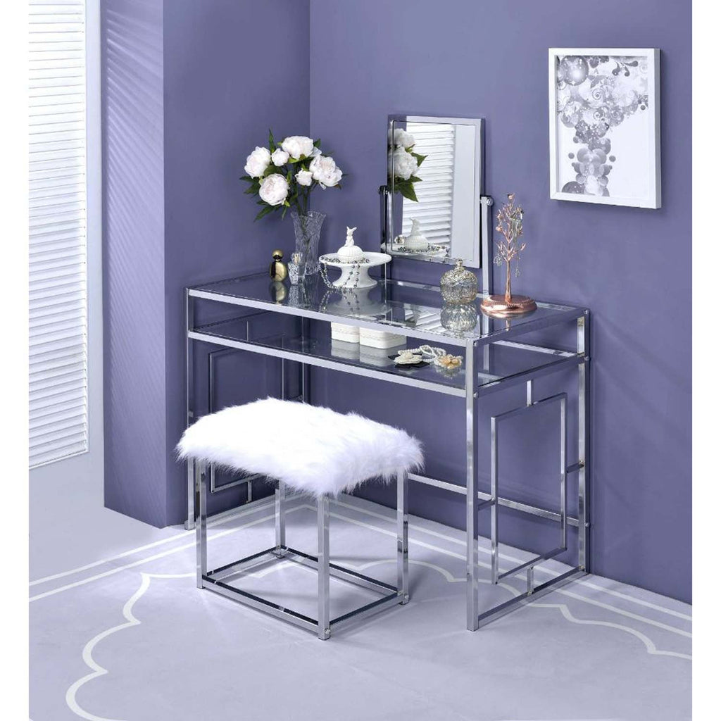 Offering plenty of storage with its contemporary style, this Carenze II vanity desk with 1 open compartment & tilt mirror is a perfect choice for getting ready in the morning. Image sitting down in front of this lovely vanity desk to apply your makeup and do the grooming while the sunlight shine in through the window, isn't it wonderful? Manufactured with chrome metal and covered with chrome & white fur, this vanity set combines elegance with fashion. Coordinate with its matching stool, it will moreover add superiority to your room.
