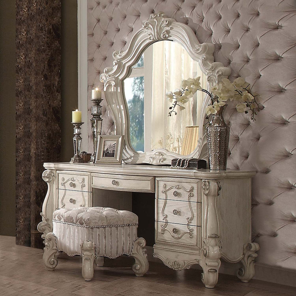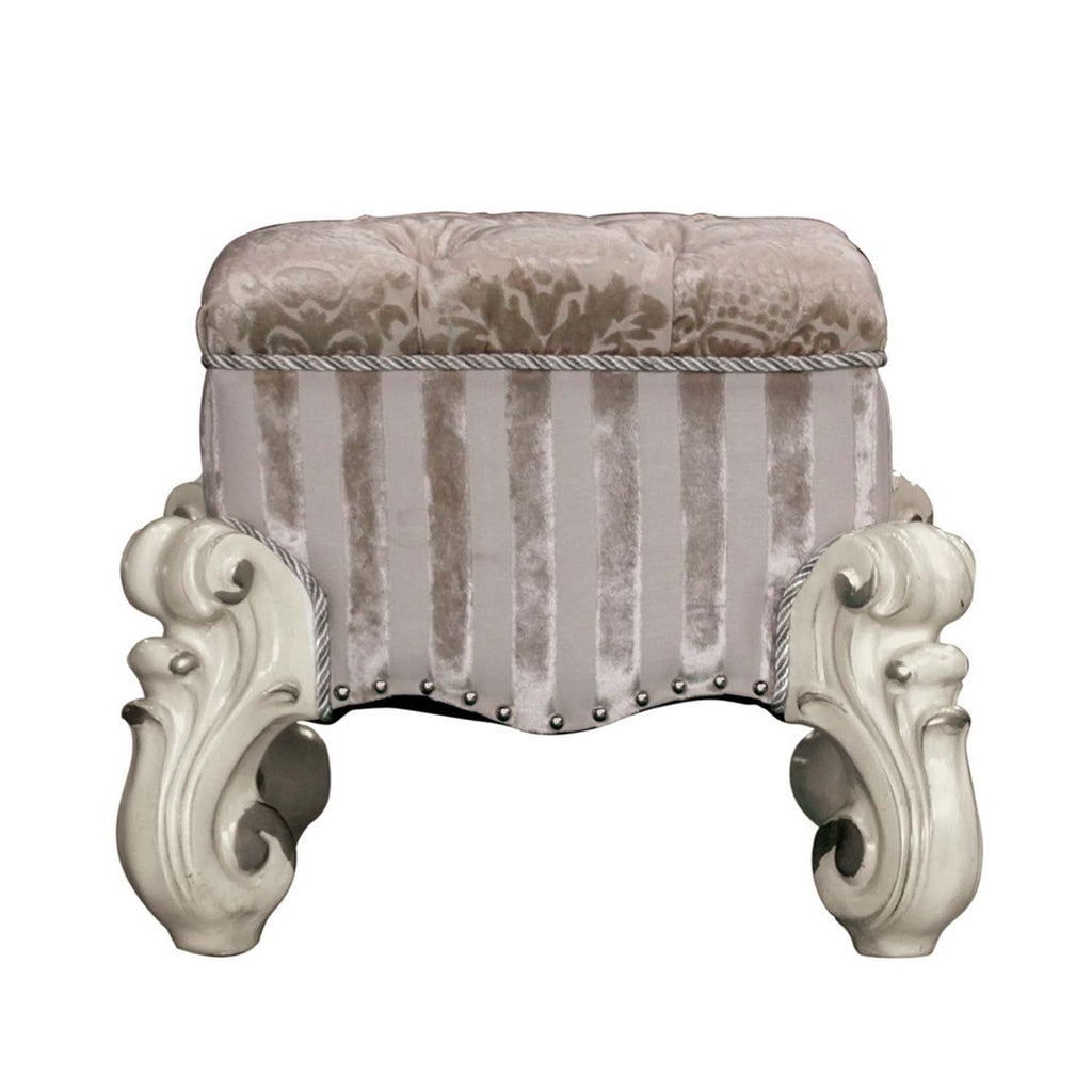The Versailles vanity stool is the perfect accent to create the style of royalty your bedroom has been needing. This vanity stool crafted in wood with bone white finish was inspired by old European design with an upholstered tight seat cushion with welted trim and intricate wood carvings on the scrolled legs.