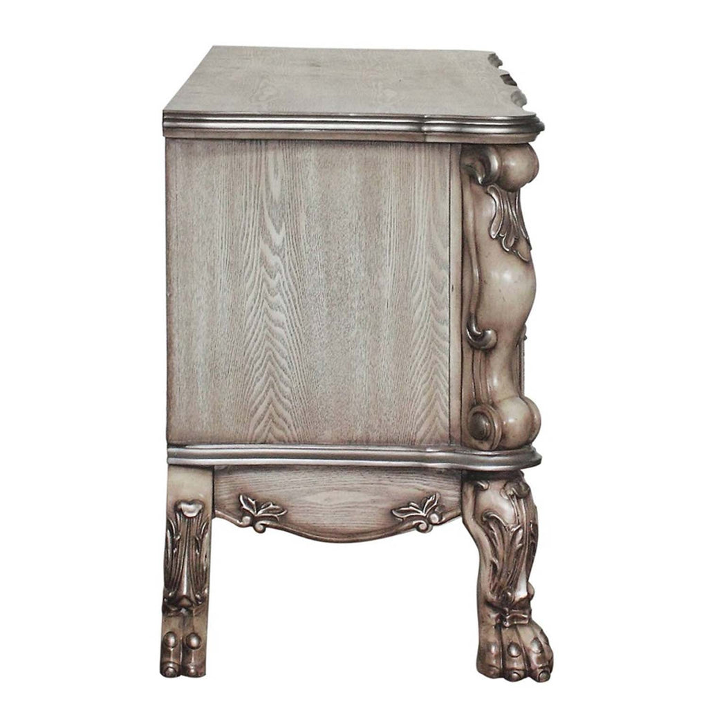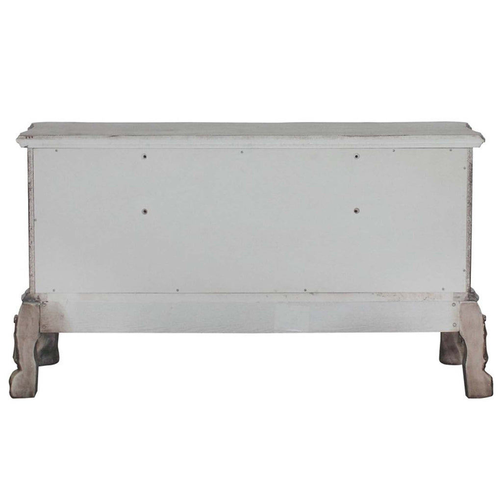 Elegant yet lightheartedly playful, this Dresden vanity desk is donned in an amiable vintage bone white finish with hand-applied burnish over the many layers of stains and finishes that are manually rubbed on, providing depth and character to this piece. The Rococo style is candidly represented in the classic ornamental features of this vanity desk, with the carefully chosen inlay, plentiful decorative scrolled moldings, and ample size worthy of a main bedroom. The five drawers and ample cabinet space provide plenty of storage for cosmetics, perfumes, and hair tools.