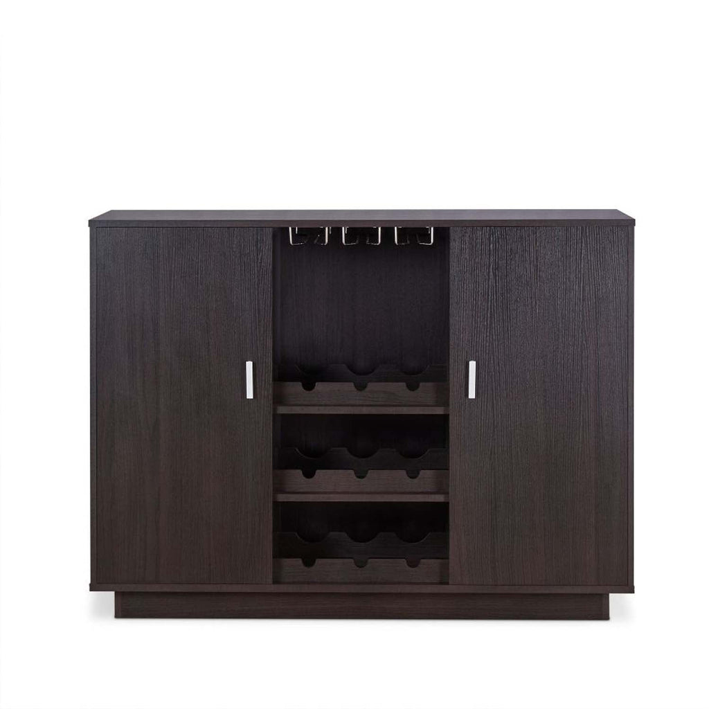 Store your beloved wines with this classic but trendy rectangular Hazen server to have them ready anytime. This chic server has 2 wooden doors, wine rack and stemware glass rack, providing plenty storage space for your convenience. Keep it close to your dining table to tuck away glasses, napkins and other essentials. Finished with espresso wooden frame, it will fit naturally in any design.