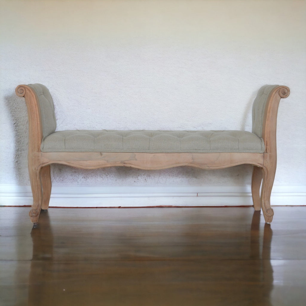 Update your home with this lovely Mud linen bedroom bench constructed from 100% solid mango wood. It is the perfect piece of furniture for a bedroom or living area, and ideal for extra seating. Other features include hand-carved cabriole legs that have a sun-bleached finish and sheltering arms.