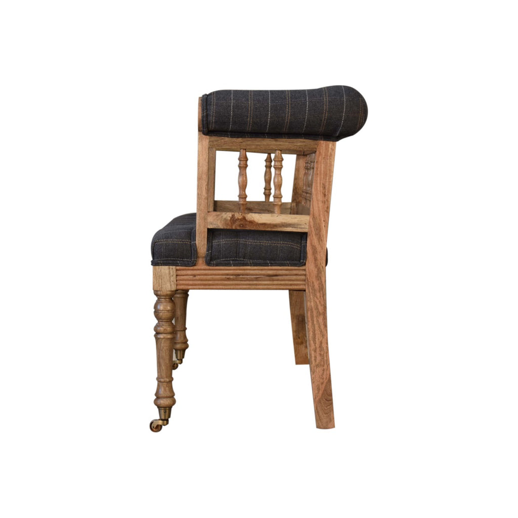 Add some luxury style to your home living area with this fabulous country hallway bench. It is constructed from 100% solid mango wood and upholstered in 100% pewter tweed. Other features include detailed hand carved and hand turned front legs with casters and an overall oak-ish finish. You may encounter variations from batch to batch hence if you are looking to pair products under similar room settings; you can opt for a bespoke order or take an informed decision about the possible variations.