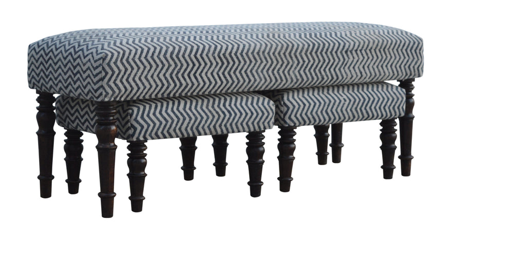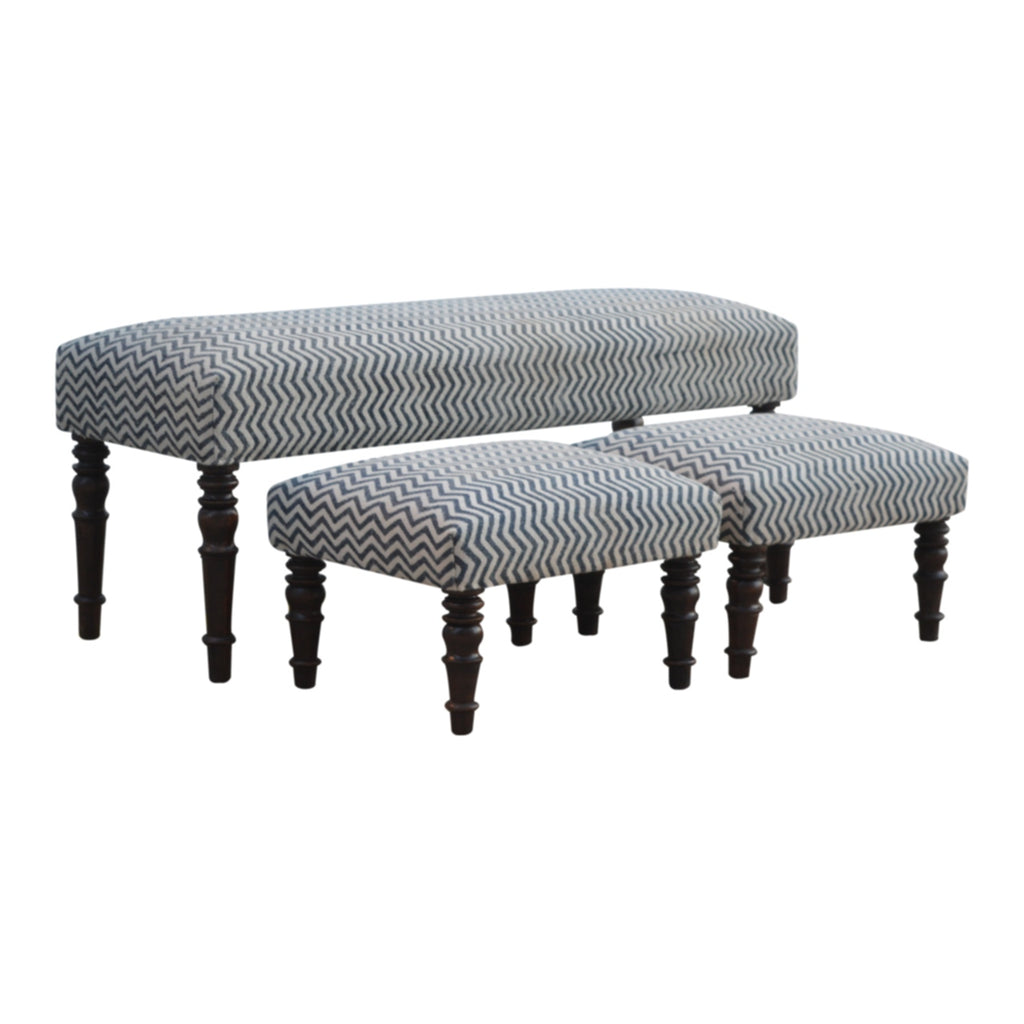 This set of 3 long benches is constructed from 100% solid mango wood and upholsterfed in natural jute dhurrie making it very comftable to sit on. Other features include hand turned feet which have a smooth light walnut finish.