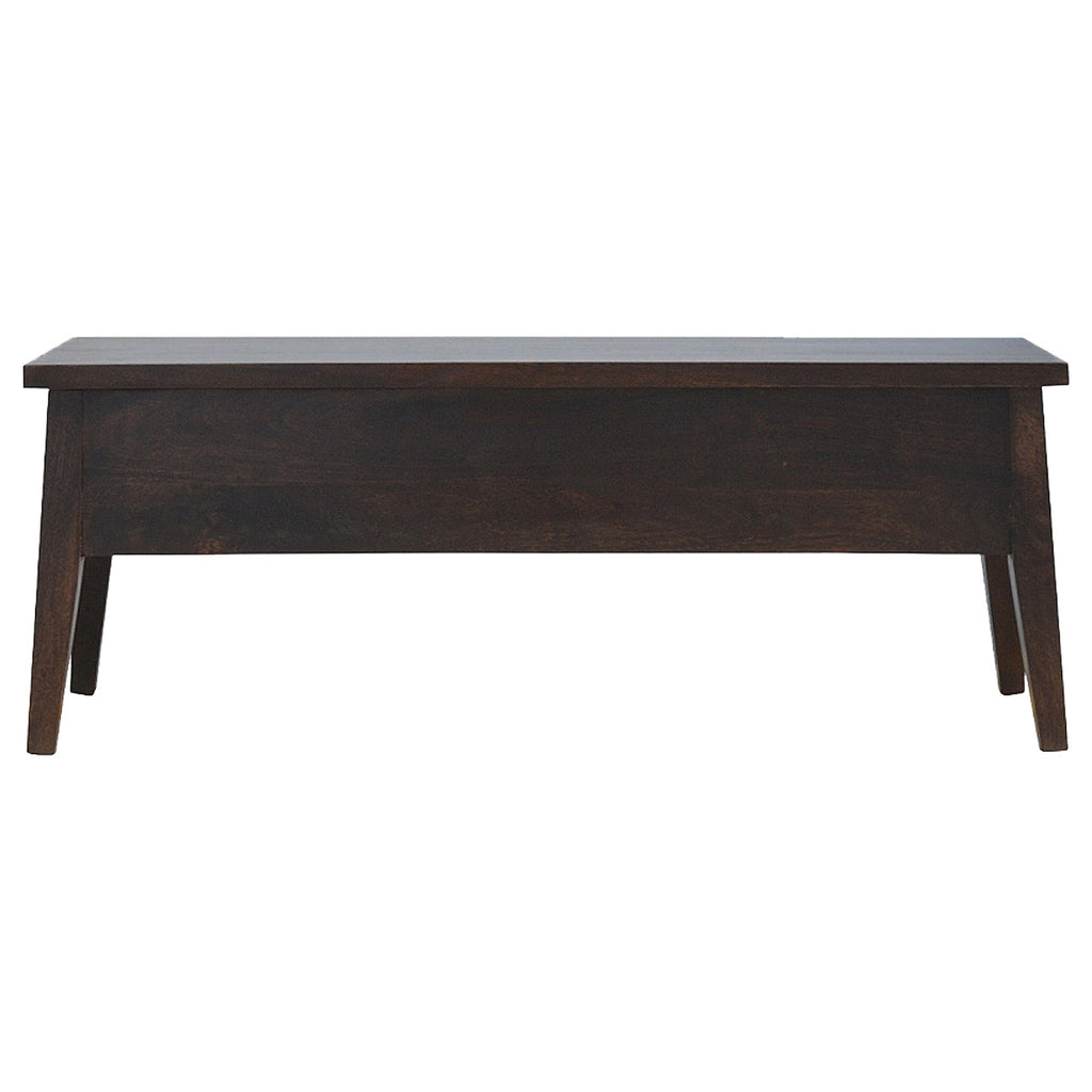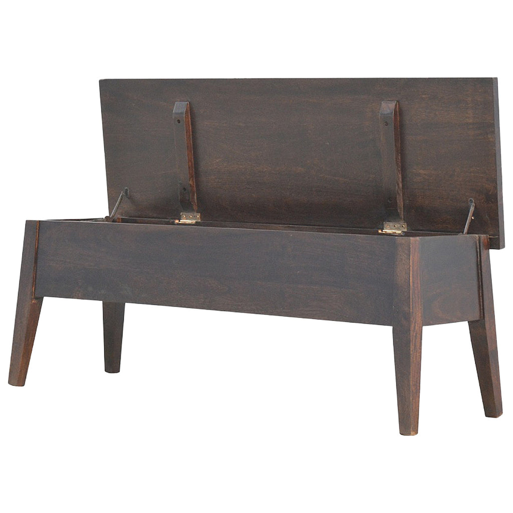 This storage bench is constructed from 100% solid mango wood and has a walnut finish. Useful storage space is provided under the seat, and the lid stays open so you can safely and easily take things in and out. A both good-looking and practical bench that gives a warm, cosy feeling works just as well in the living room, hallway or bedroom. Other features include 4 Scandinavian styled legs.