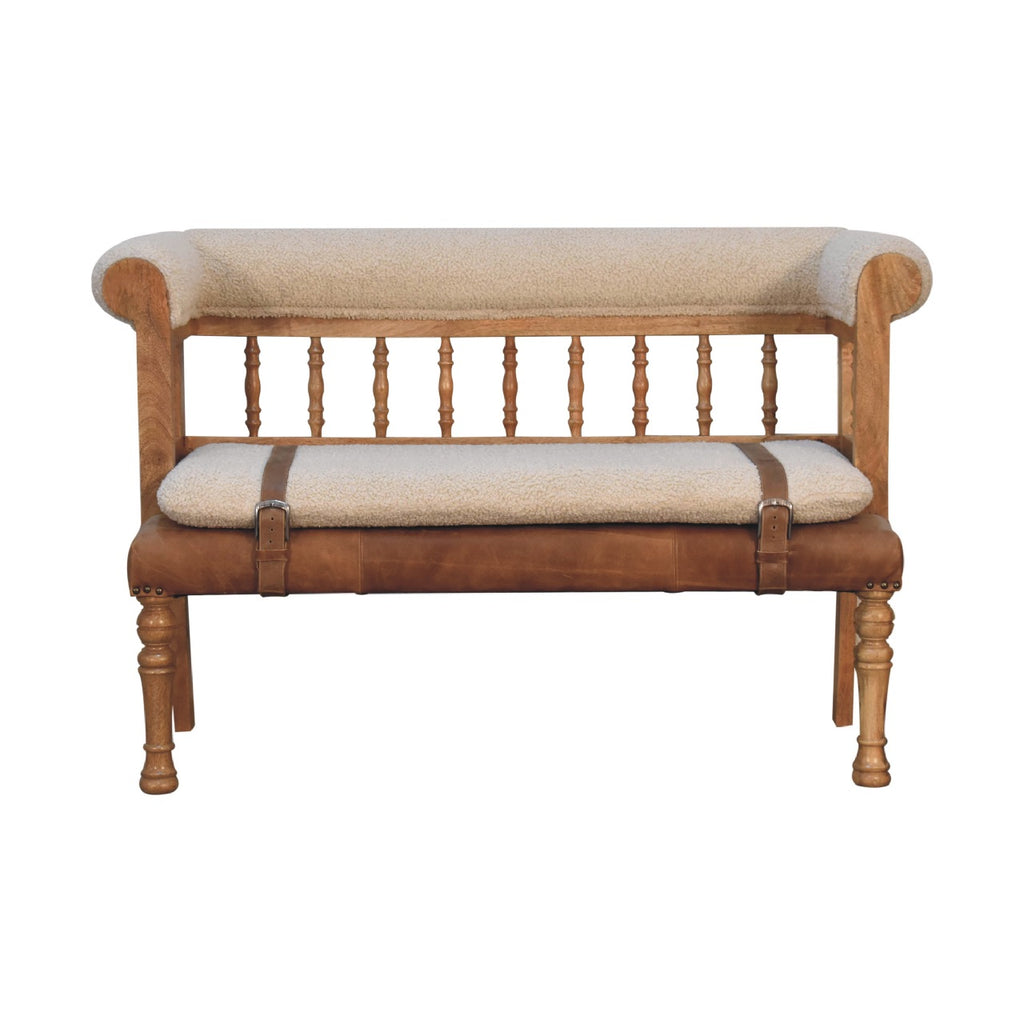 Add some luxury style to your home living area with this fabulous carved hallway bench. It is constructed from 100% solid mango wood in an oak-ish finish and upholstered in 100% cream boucle which is presented on the seat and backrest. Other features include buffalo leather buckle straps which can be secured or undone and hand turned front legs.