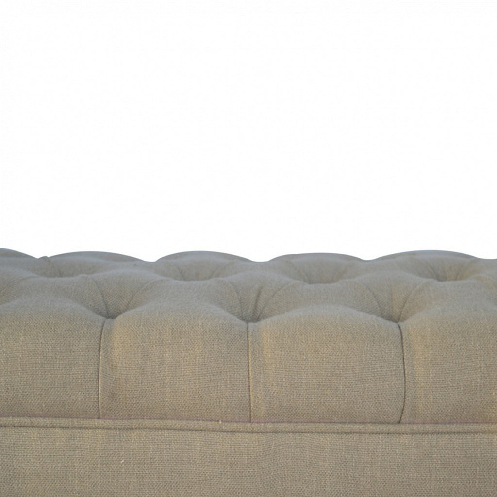 Update your home decor with this lovely mud linen upholstered bench constructed from 100% solid mango wood. It is the perfect piece of furniture for a bedroom or living area, and this bench is ideal for extra seating. Other features include hand turned legs that have a fine light walnut finish, deep buttoned upholstered top and sheltering arms.