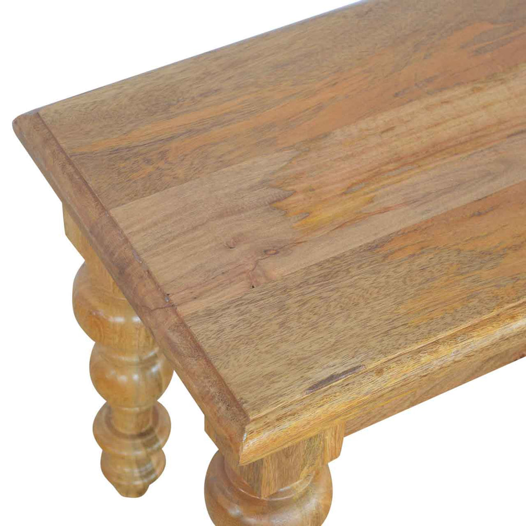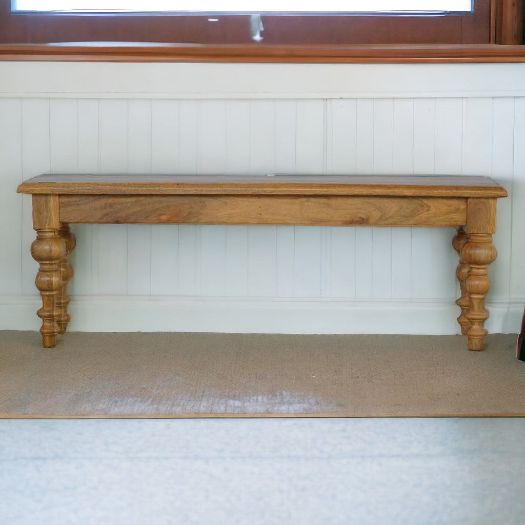 This bench is constructed from 100% solid mango wood and has a fine oak-ish finish, it features hand turned legs and a thick top and can be used as a dining table bench or a hallway bench, and will make the perfect addition to any home. Every piece of furniture is individually handcrafted and includes swing care tickets explaining the cautions and aftercare instructions.