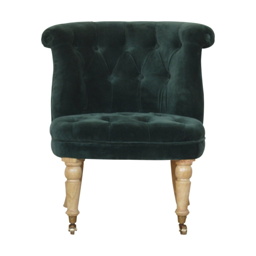 This petite accent chair is beautifully hand carved from 100% solid mango wood and upholstered in a beautiful emerald green cotton velvet. Other features include deep button tufts, 2 caster legs at the front and 2 tapered legs at the back. All 4 legs have a fine oak-ish finish. Perfect to add some extra character and definition to the home.