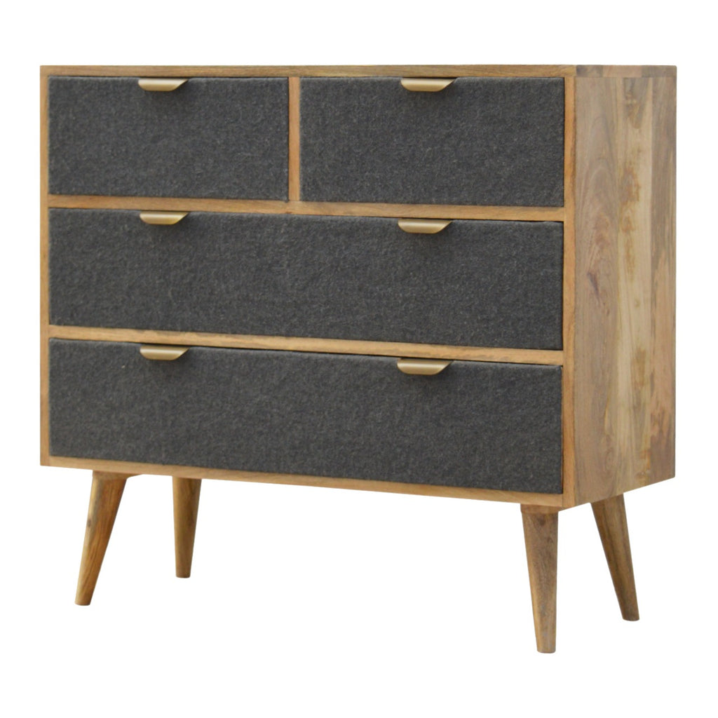 Finished with fabric front drawers, and upholstered in a grey tweed to match perfectly with the fabric front writing desk, this chest takes a different twist on furniture with the contrast of 2 materials and combining them together. It features a solid wood body finished in an oak-ish finish and a golden pull-out handle with 4 Nordic style legs. It is the perfect addition to both modern and country homes. It has 2 large drawers and 2 smaller drawers for storing your clothes or any belongings neatly in the bedroom.