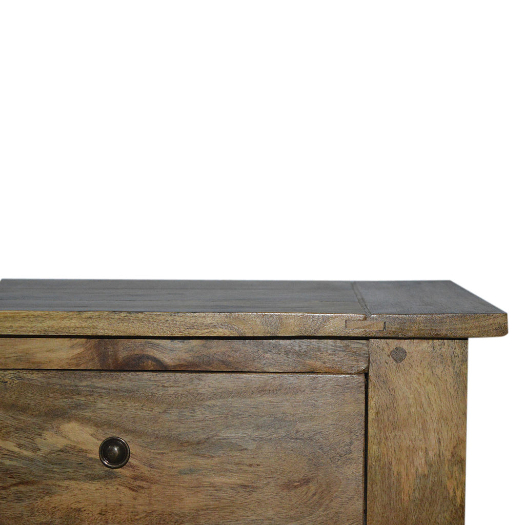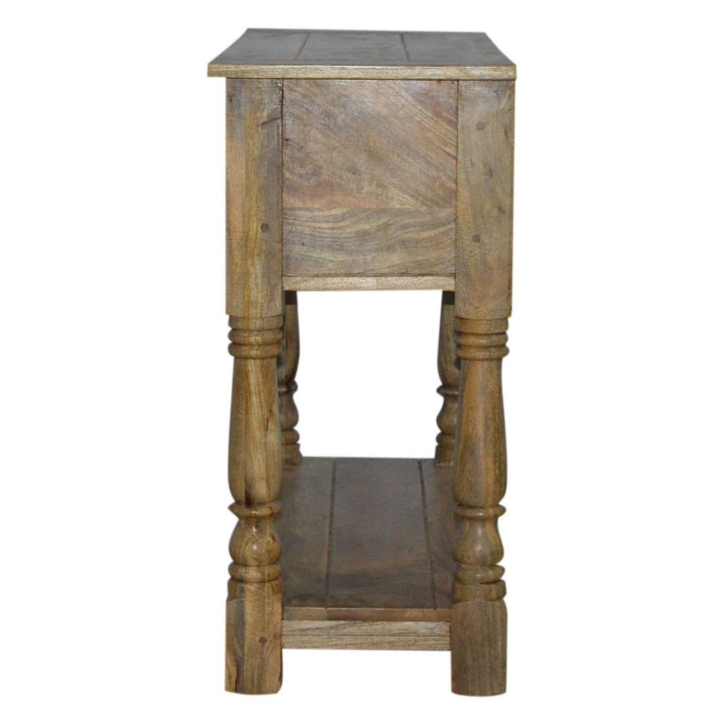 Simple, elegant, is what this practical hallway country style console table will provide. This 100% solid mango wood unit has been built with sustainably sourced timbers and has two drawers to help you keep your home organized and storing any little household objects. Other features include 4 hand turned legs, knobs; shelf at the base and this console table has a fine oak-ish finish.