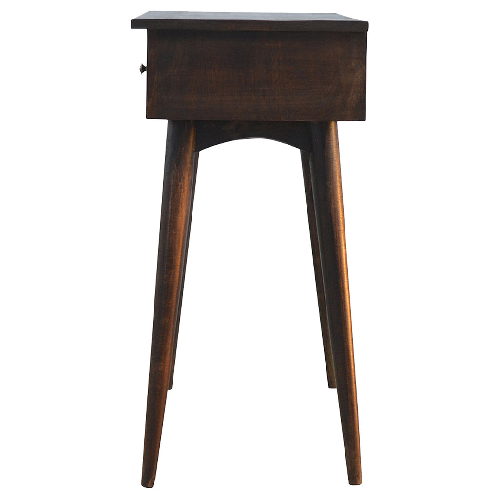 Simple, elegant, country-style charm is what this practical little console table will provide. Suiting most decors, this 100% solid mango wood unit has been built with sustainably sourced timbers and has two drawers to help you keep your home organised and storing any little household objects. This has shiny knobs and has a light walnut finish.