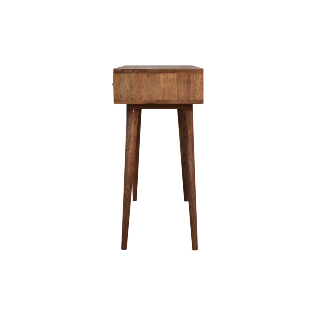 This 2 drawer console table has been constructed from 100% solid mango wood and finished in a fine oak-ish finish body. The main feature of this piece are the screen printed drawer fronts which have a beautiful black and white geometric design giving the piece extra dimension and character. It also has 4 Nordic style legs and ample space on top for a plant, photo frames or ornaments.