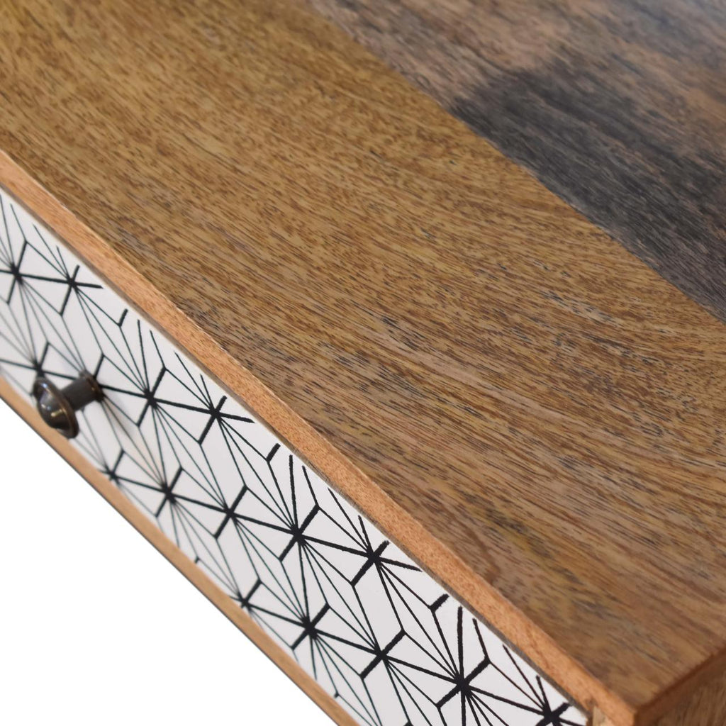 This 2 Drawer console table has been constructed from 100% solid mango wood and has been finished with an oak-ish finish body. The main features of this piece are the screen printed drawer fronts which have a beautiful black and white geometric design giving the piece extra dimension and character. Useful storage is provided with the spacious drawers that can be used to store any papers, notebooks or stationary. It also has 4 Nordic style legs and a good sized table top to work or study on.