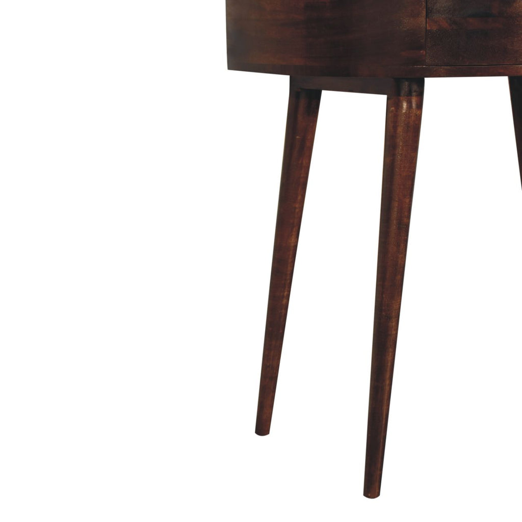 This beautifully designed console table is constructed from 100% solid mango wood in a california walnut finish and has a smooth circular design along with a shiny brass knob for easy access. A lovely, simple addition and accent piece for the home which can be incorporated with different interiors and styles of furniture.