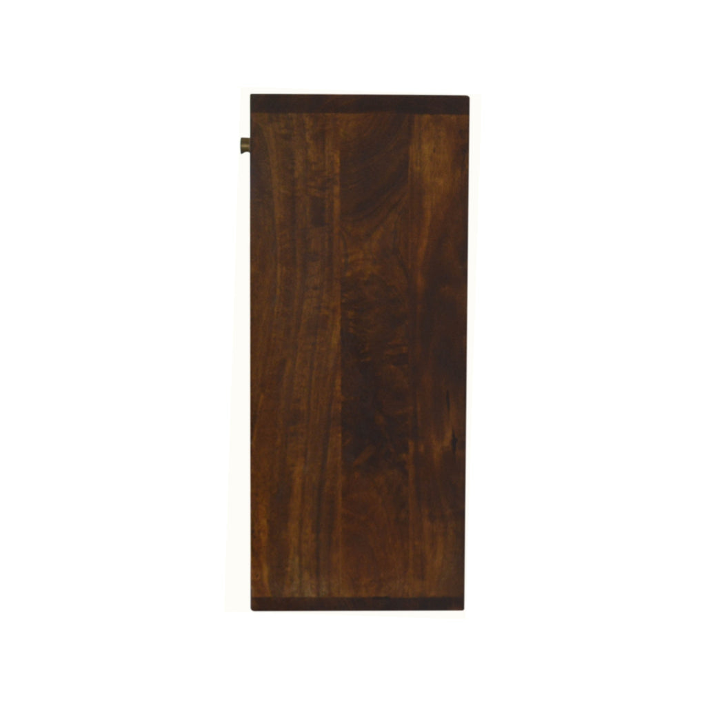 Inspired by vintage design, this solid wood flip-down writing desk provides ample space for you to work on. It is a wall mounted piece, perfect for storage saving solutions. It is constructed from 100% solid mango wood and has a fine chestnut finish. Other features include 1 large shelf and 2 smaller shelves perfect for working and studying. The gold brass inlay detail brings the whole piece together.