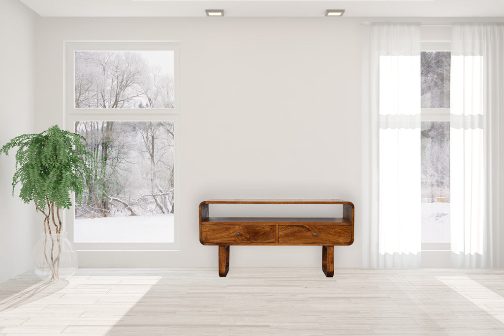 This chestnut media unit is the perfect piece for keeping your living room tidy, with 2 drawers and a large open slot it enables plenty of storage space in the home. A take on the original curved chestnut media unit, this new design features u-shape legs. It is constructed from 100% solid mango wood in a chestnut finish.