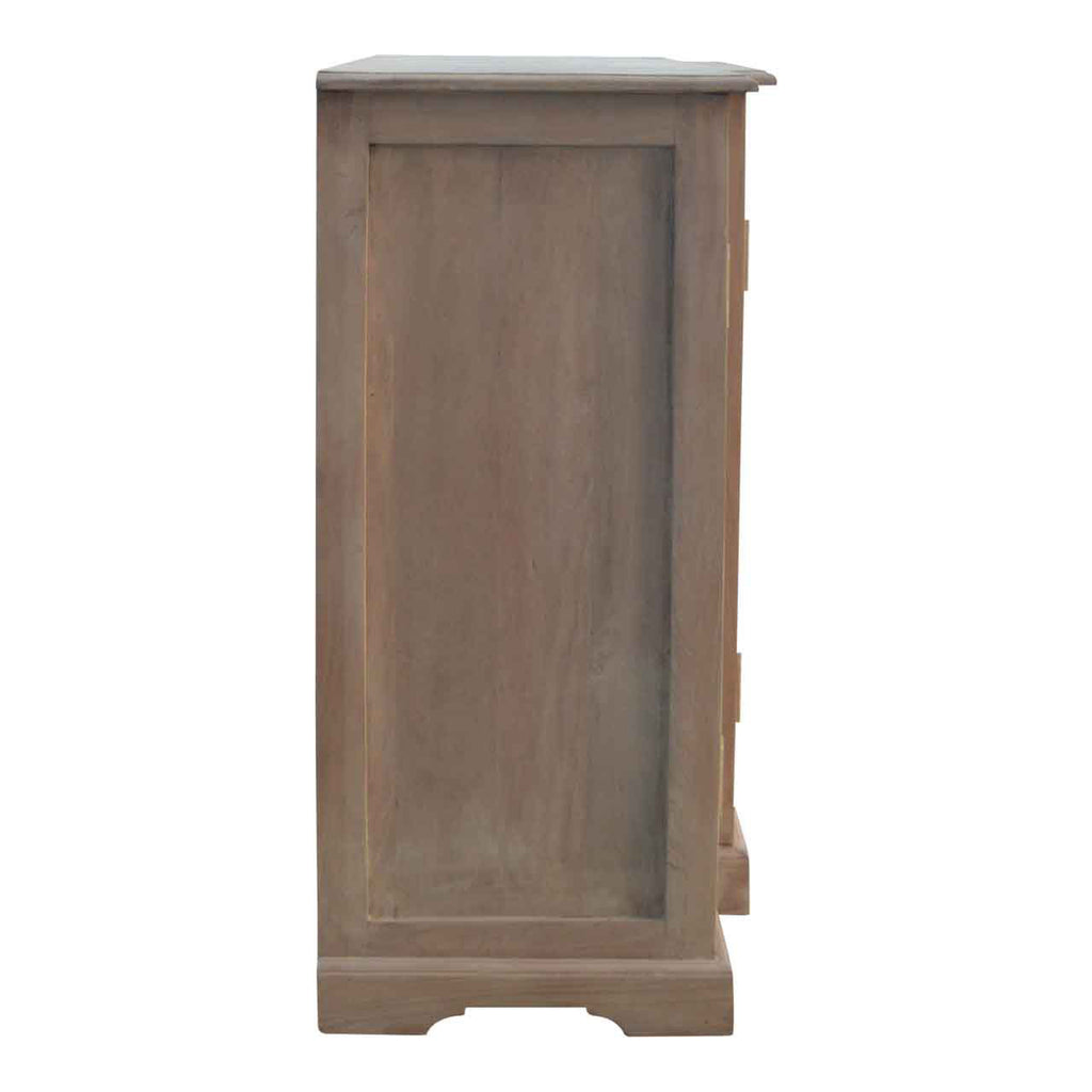 This media unit is made from 100% solid mango wood and has a smooth sun-bleached finish. This product offers excellent storage space with 4 antique glazed door cabinets which have a solid wood pattern, and a decent size top for your TV, pictures and special ornaments etc. Other features include a plinth bottom, round knob handles and a thick top. Add this stunning sideboard to your home.