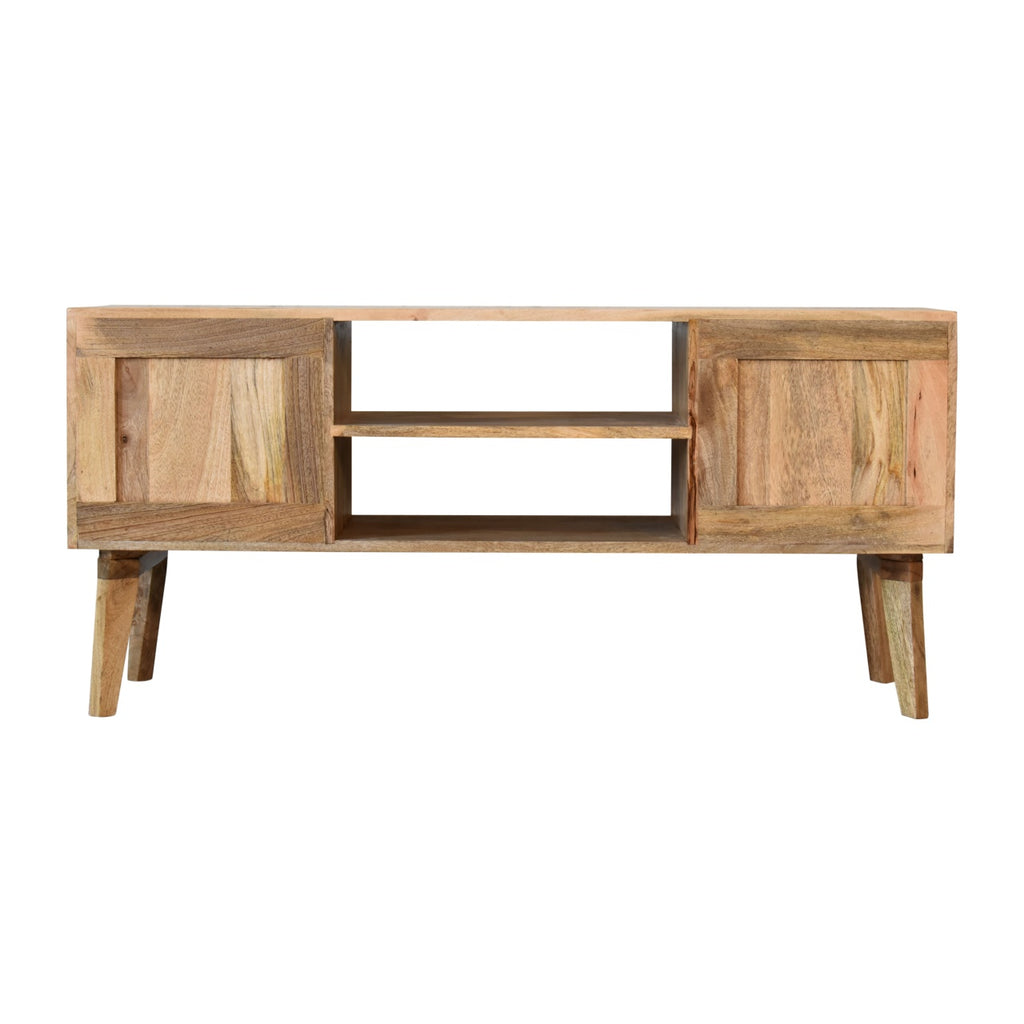 A beautiful addition to your bedroom, this Safi Media Unit features a contemporary, stylish design. Finished with a unique mixed wood door front this piece will look smart in almost any decorating scheme. It is constructed from 100% solid mango wood and also features 2 large open slot, shiny brass knobs and nordic style legs.