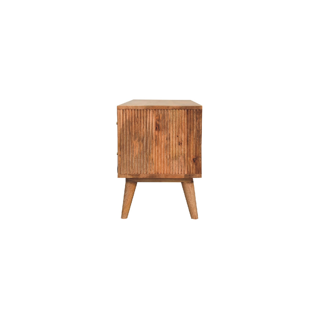 This media unit has been constructed from 100% solid mango wood in a fine oak-ish finish. The beautiful slate drawers are definitely prominent in this piece and provide a lovely contrast with the finish of the wood Other features include nordic style legs and shiny bass knobs.