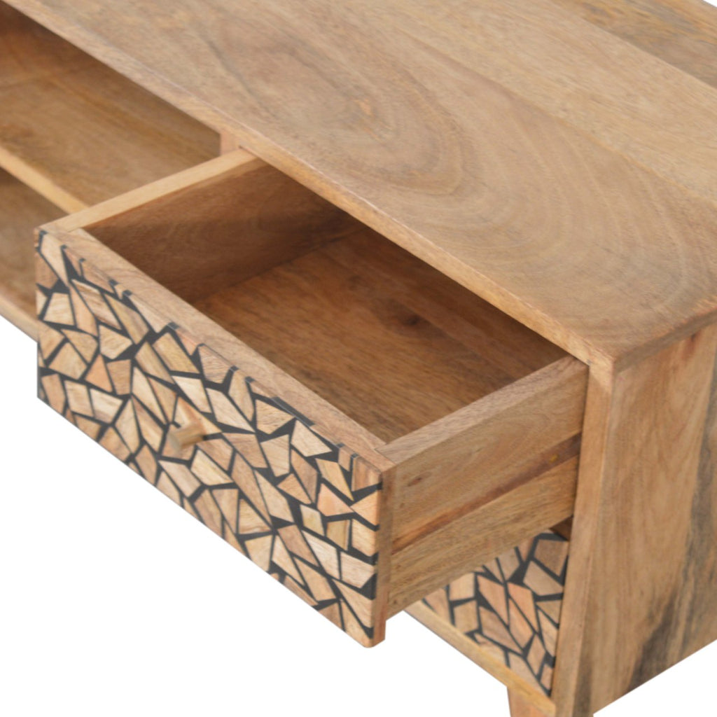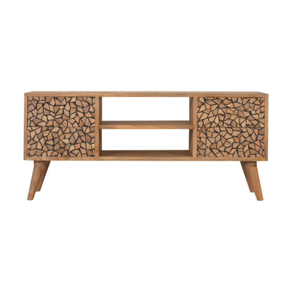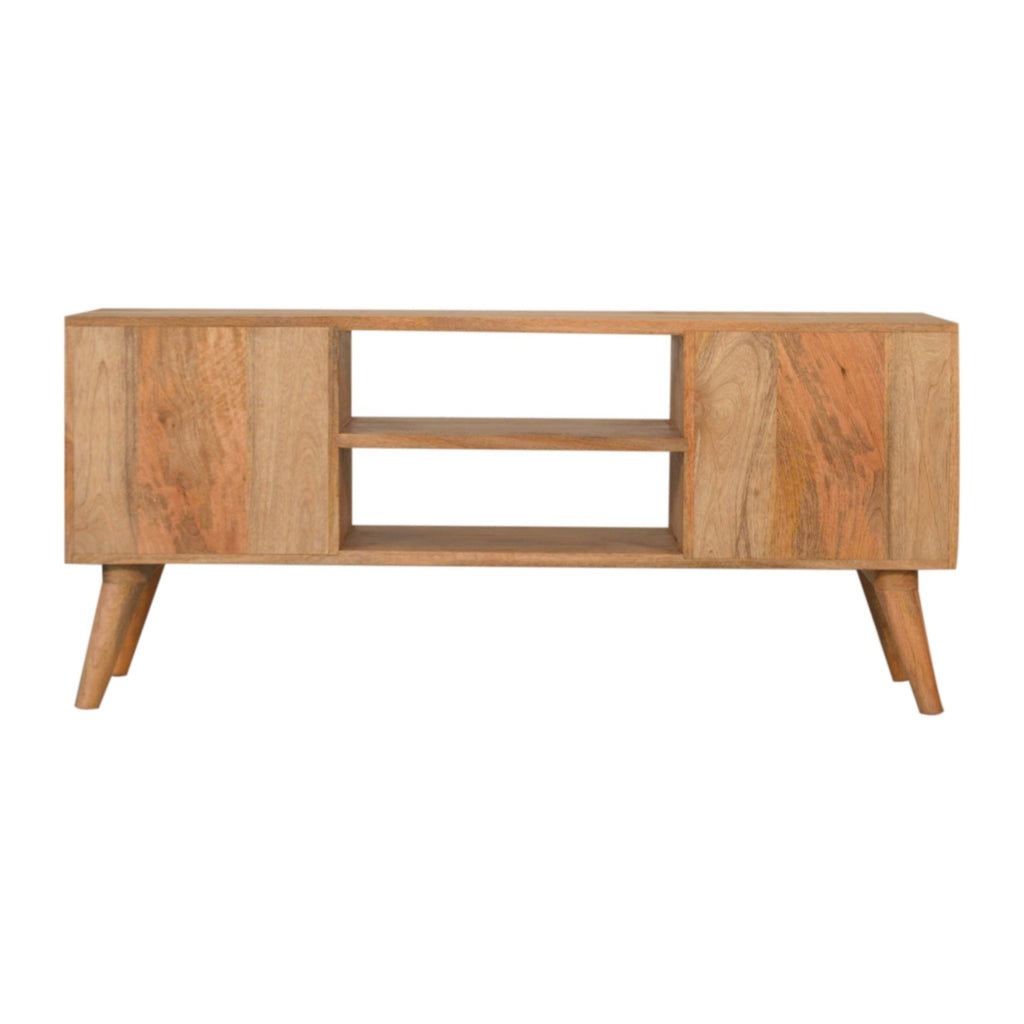 This media unit has been constructed from 100% solid mango wood in a oak-ish finish. It has 2 drawers and 2 open slots for storage convenience and features nordic style legs with shiny brass knobs which give a lovely contrast against the print. More items available from the Lisbon range.